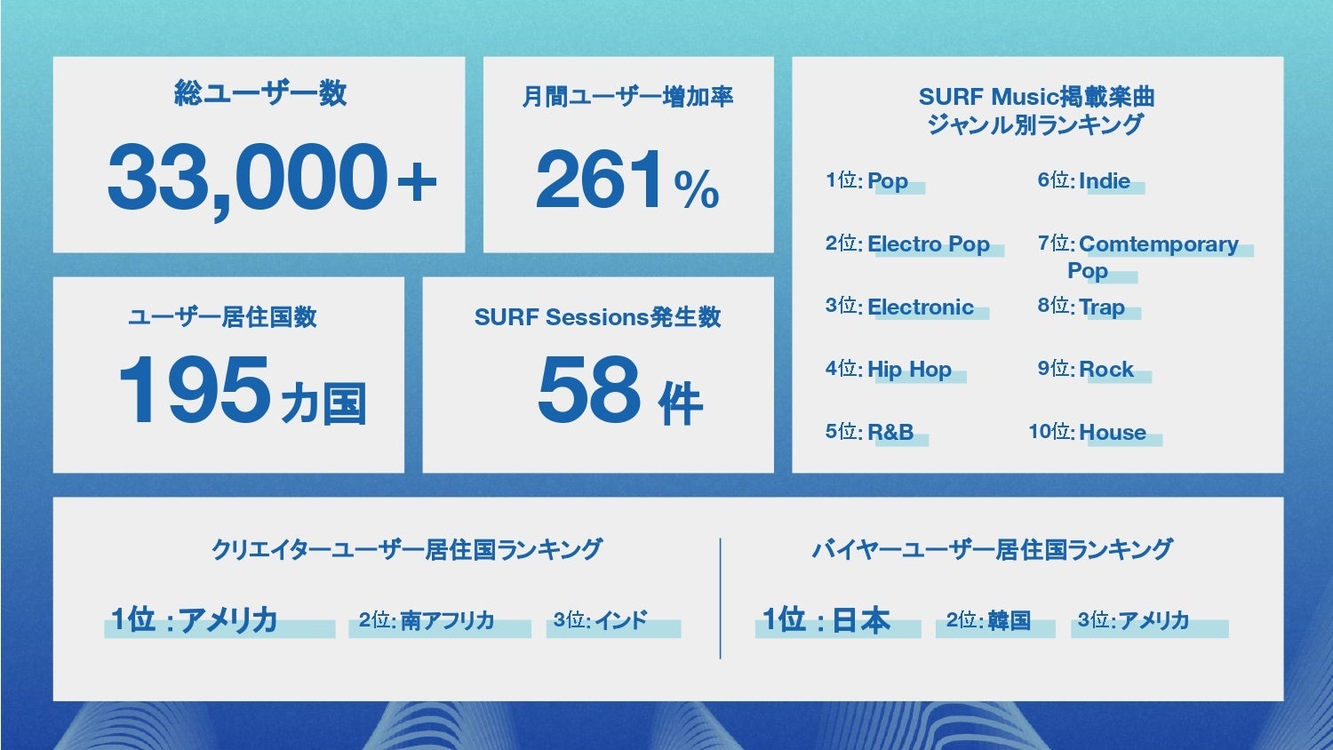 今年はユーザーの居住地が195カ国に拡大し、ユーザー数は昨年からおよそ3,000%の増加率となる33,000人のユーザーがSURF Musicに登録。月平均では261%の新規ユーザー増加率を記録し、特にアメリカや日本、フィリピン、インドで顕著な成長を遂げました。さらに、Billboard JapanやオリコンシングルチャートでのTop10のランクインやゴールドディスク認定も獲得した楽曲も生まれました。また、米有力誌FAST COMPANYやSmart Asia Appといったグローバルアワードを受賞するなど、SURF Musicの価値は国際的にも高く評価されています。