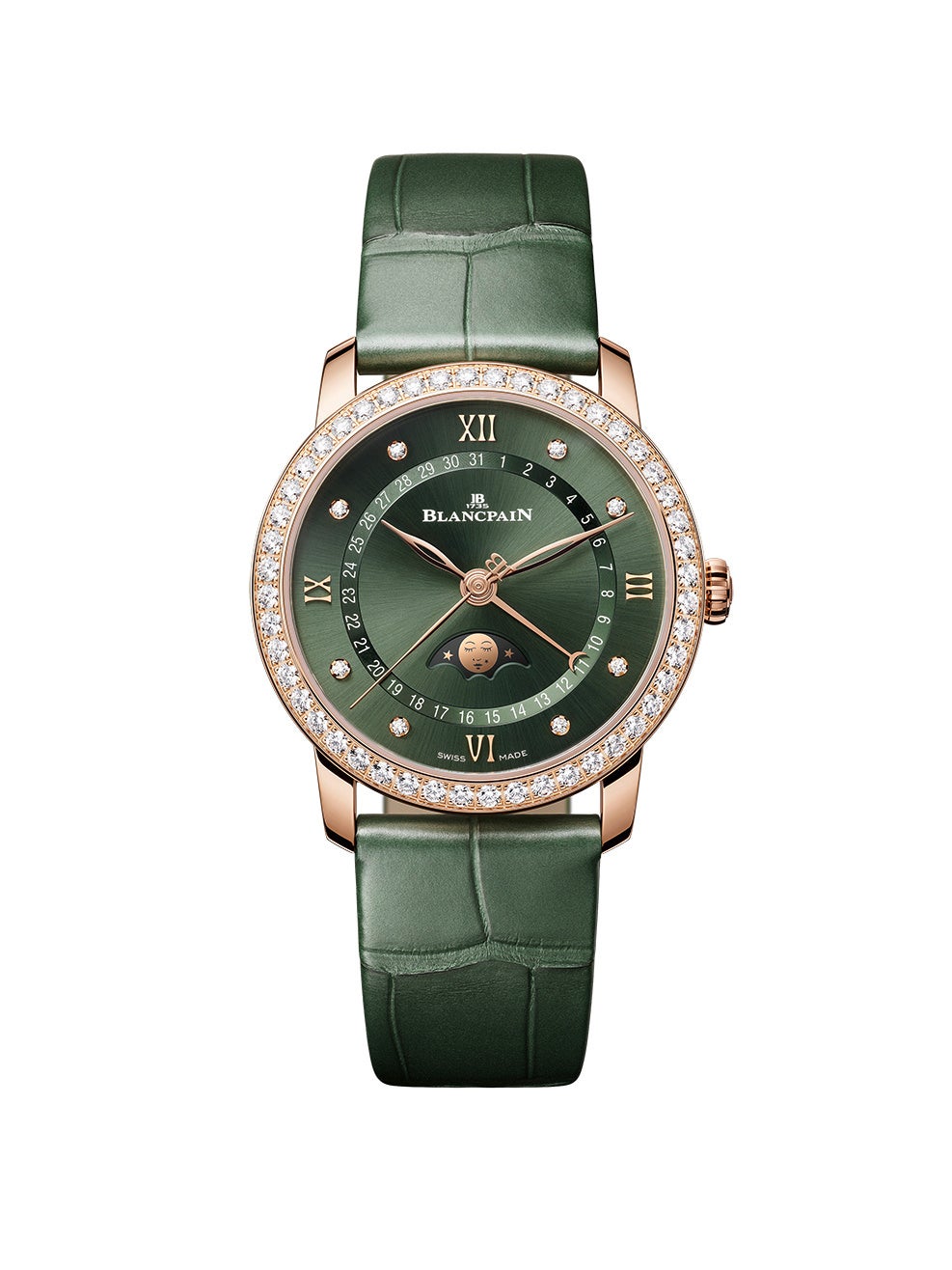 ブランパンの象徴であるムーンフェイズを搭載したヴィルレ デイトムーンフェイズは、詩的な趣を漂わせています。口元につけぼくろや、長いまつげの閉じた瞼があしらわれた、ブランパンのフェミニンなムーンフェイズは、きわめて魅力的な要素となり、この作品に命を吹き込んでいます。優美な表情を湛えるこのムーンフェイズは、日付表示のサークルと先端が三日月の形をした針とともに、月のサイクルを表示します。ダイヤルとケースには星空を想起させる、およそ1ctのブリリアントカットダイヤモンドがあしらわれ、新しいグリーンのダイヤルには繊細なサンレイ仕上げが施されており、その落ち着いたグリーンの色合いはストラップにも採用されています。昼夜を問わず、このタイムピースは無数の光のように輝きを放ちます。18Kレッドゴールド製33.20mmのケースの中に自動巻きムーブメント913QL.Pを搭載した、まさに究極の機械式時計です。