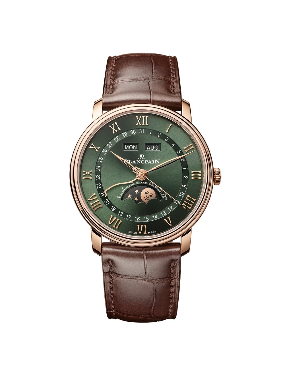 コンプリートカレンダーとムーンフェイズが融合したヴィルレ コンプリートカレンダーは、驚異的な機械式時計です。日付表示サークルと2つの専用窓で日付、曜日、月を表示する、18Kレッドゴールド製40mmのタイムピースは、絶妙なデザインと快適な視認性を併せ持つ美しいフォルムを備えています。繊細な色合いのグリーンの新しいダイヤル、レッドゴールドの針、そしてインデックスのコントラストにより、情報の視認性が高められるとともに、独特の温かみを添えています。複雑なカレンダー機構を確実に保護するため、キャリバー6654が搭載されており、指で押すだけで操作できるブランパンの特許技術アンダーラグ・コレクターを用い、カレンダー表示をいつでも調整することができます。
