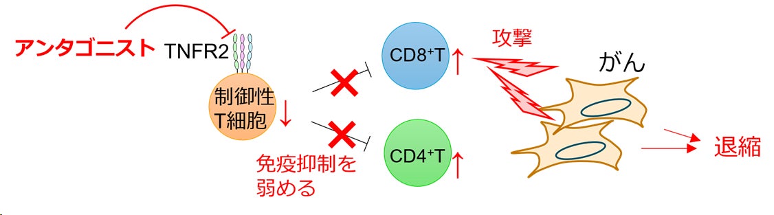 図1. TNFR2アンタゴニストは制御性T細胞による抗がん免疫の抑制状態を解除し、がんの退縮を誘導し得る