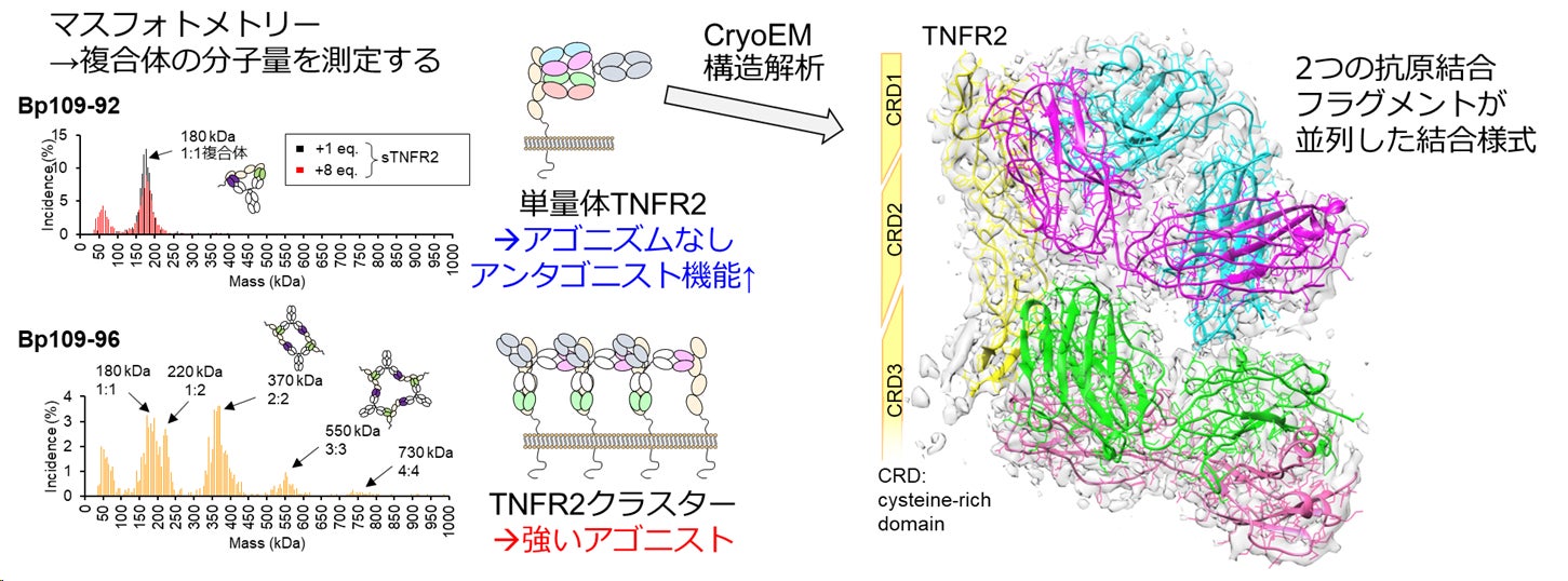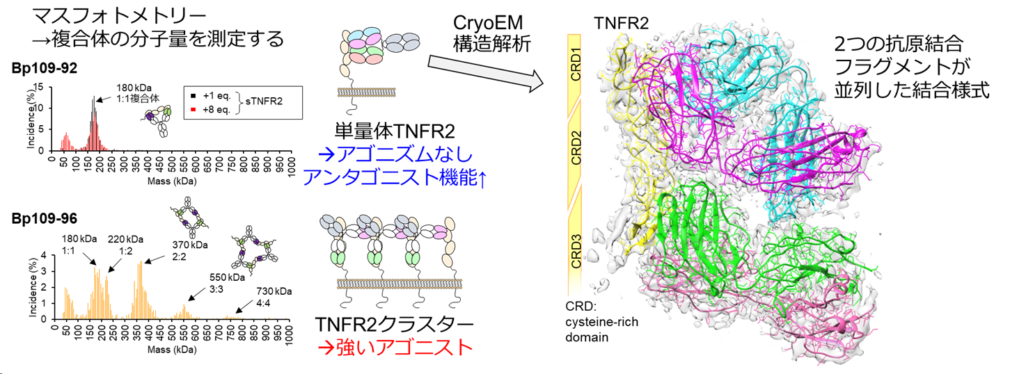 図5. BpAbとTNFR2の形成する複合体の大きさと活性の関連、アンタゴニストBp109-92の複合体構造のクライオ電子顕微鏡による単粒子構造解析