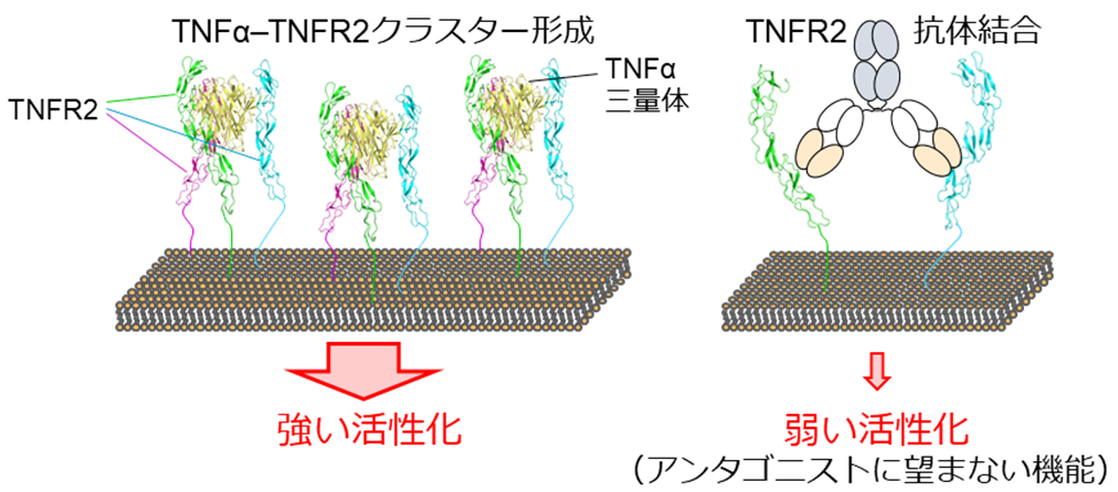 図2. TNFαによるTNFR2活性化<左>と天然型アンタゴニスト抗体では不可避なTNFR2の微弱な活性化(副反応)<右>