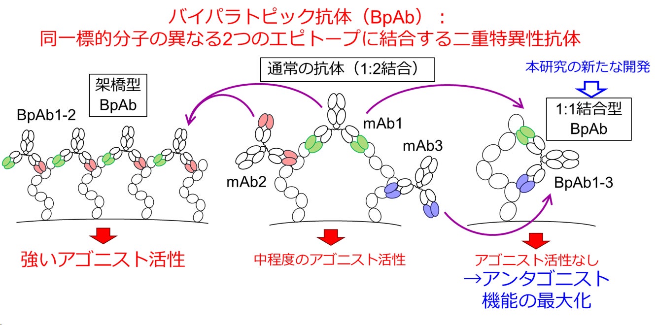 以上の結果から、適切なエピトープに結合する2点の抗体を選定することで、1:1複合体のみを形成するBpAbが取得され、これが優れたアンタゴニストとして機能し得ることを明らかにしました。従来の研究から抗原架橋型BpAbからアゴニストを容易に得られることが知られていましたが、本研究ではこれにとどまらない卓越した機能がBpAbのデザインで実現できることを明らかにしました。