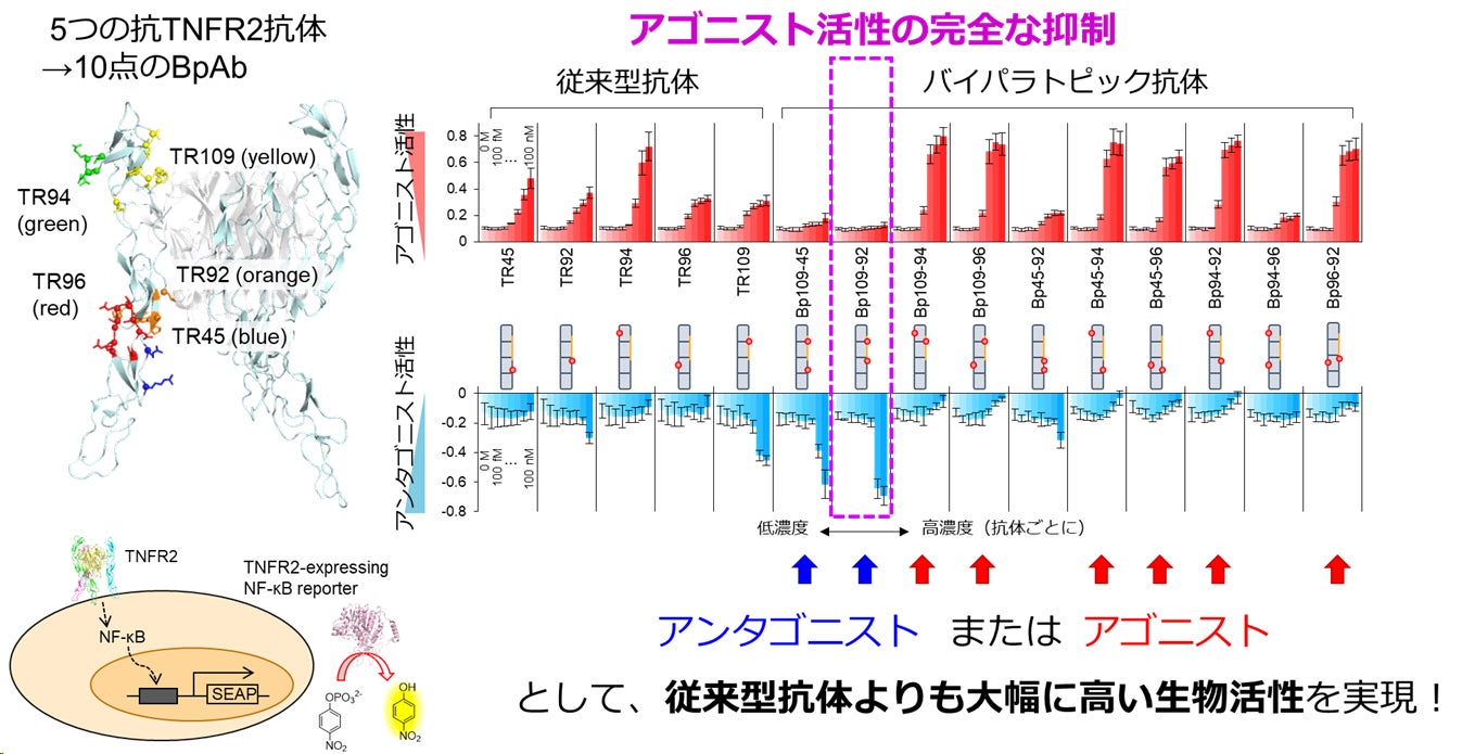 異なる抗体は、それぞれ固有のエピトープに結合し、異なる機能を示します。CDDRでは、標的抗原分子表面全体に提示されている多様なエピトープに結合し機能する抗体群を網羅的に取得する「エピトープ均質化抗体パネル」法を開発しています(特許7054209)。この中で、TNFR2の複数のエピトープ領域に結合する抗体群を同定していました。本研究では、その中で異なるエピトープグループに属する5点の抗体を選び、以前に私たちの開発し報告した二重特異性抗体作製法(Akiba et al, Sci. Rep. 2021, 11, 19411)を利用して、10点のBpAbを取得しました。5点の天然型抗体と10点のBpAbのアゴニスト活性並びにアンタゴニスト活性をNF-κBレポーター細胞によって調べたところ、天然型抗体はいずれも弱いアゴニスト活性を示し、うち1点(TR109)が同時にアンタゴニスト活性も示しました。一方で、BpAbは10点のうち6点もが、天然型抗体よりも強いアゴニスト活性を示し、2点が強いアンタゴニスト活性を示しました。特筆すべきことに、Bp109-92は、全くアゴニスト活性を示さず、私たちの目標であった、天然の抗体では避けることが難しい、アゴニスト機能の不活性化に成功しました(図4)。