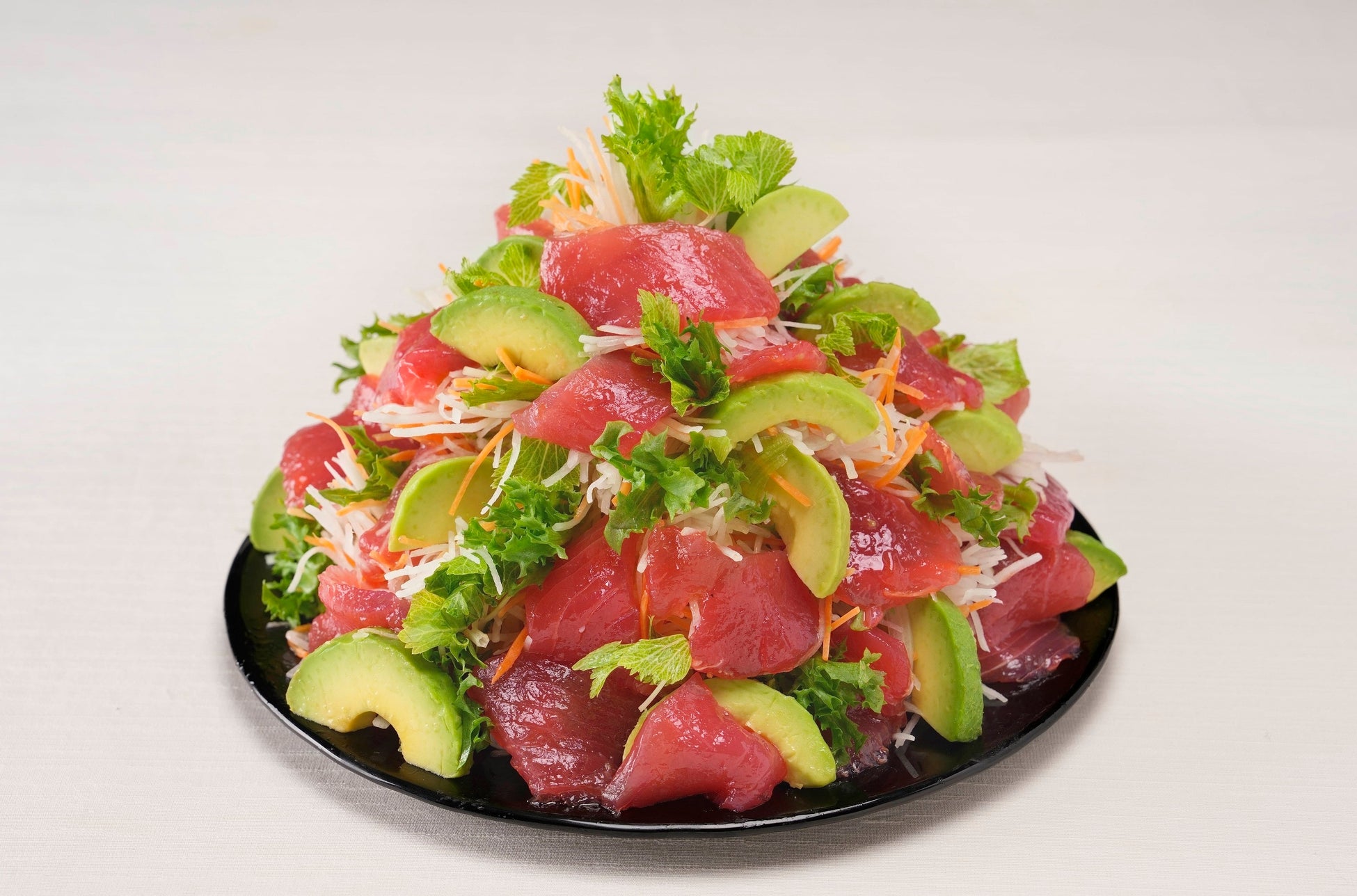 『北海道産ホタテのマリネ~自家製トマトソース~ 』は、店内厨房でお作りするこだわりのトマトソースが、瑞々しい帆立の甘みと旨みを引き立てます。同じく新作の『マグロとアボカドのサラダ』は、主役のマグロと相性の良いアボカドを合わせ、ホワイトセロリやオニオン、人参、大根などの野菜もたっぷり入ったボリューム感のある贅沢なサラダです。