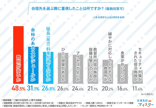 「合宿先を選ぶ際に重視したことは何ですか?(複数回答可)」と質問したところ、『費用が安いか(48.5%)』と回答した方が最も多く、『余裕のあるスケジュールか(31.1%)』『延長(延泊)料金が高くないか(26.8%)』と続きました。