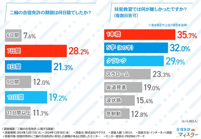 7~8日間と回答した方が約半数であることから、合宿なら1週間程度で二輪の免許を取得できるようです。
