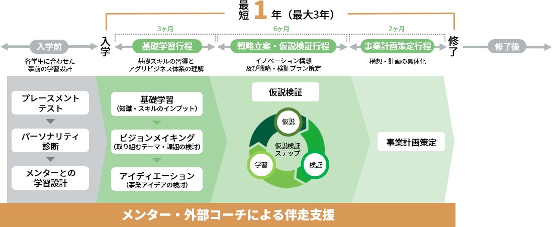 アグリビジネス領域で新たな価値の創出や課題解決に取り組みたい方に向けた実践中心のカリキュラム。アイデア創出から仮説検証、計画策定を最短1年で行う。
