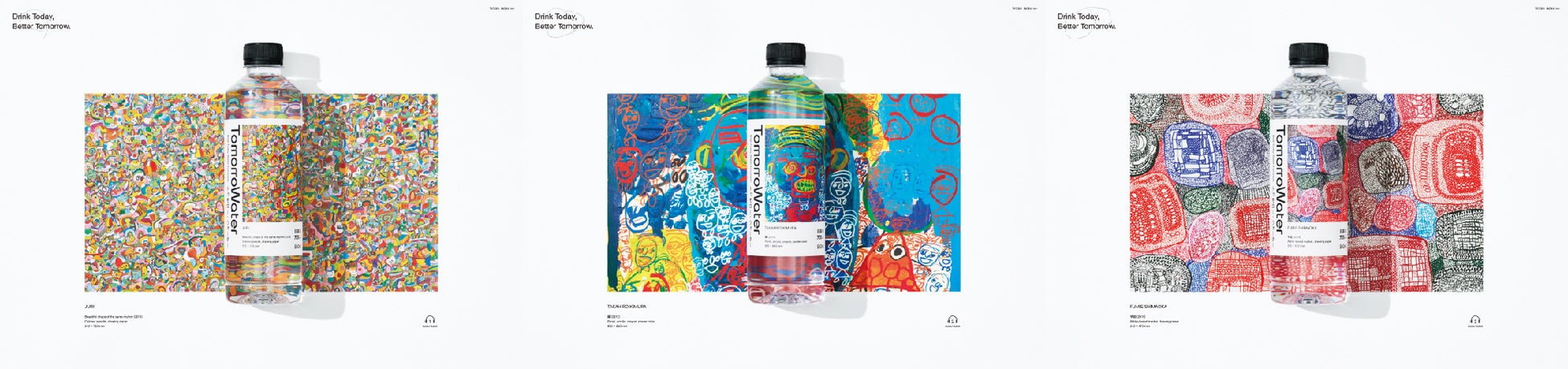 「トゥモロー・ウォーター」は異彩作家とともに新しい文化をつくる株式会社ヘラルボニー契約作家3名のアートを施した天然水です。より作家の独創的なアートを表現するために、特別な色を持たない水をキャンバスにし、多彩な作家の作品を引き立たせる“ギャラリー”のようなパッケージデザインを採用しています。