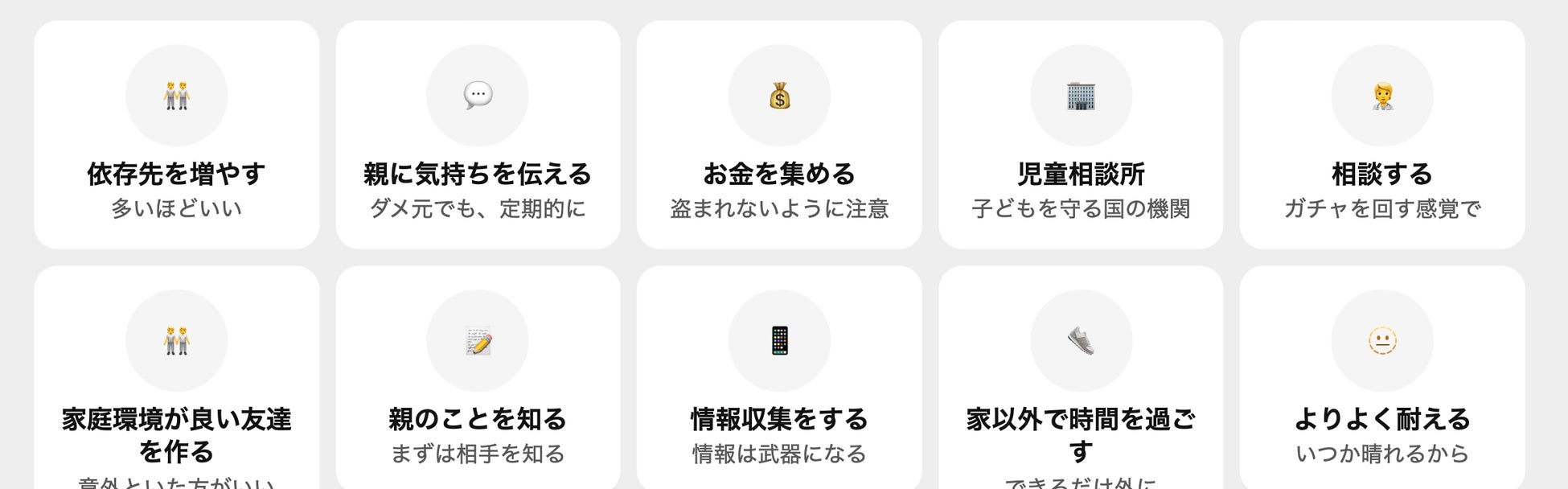 少年少女を助ける社会資源(手札)の情報を、「家以外の居場所を探したい」「親に気持ちを伝える」などのシチュエーションに応じたナビゲーションを導入。子ども・若者が使いやすい情報体系へと刷新。