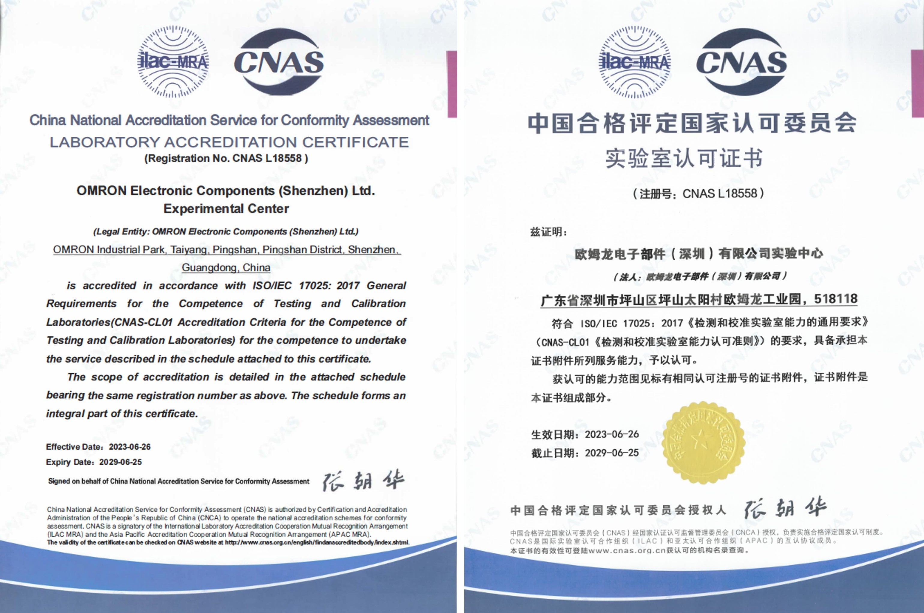 オムロン株式会社(本社: 京都市下京区、代表取締役社長 CEO: 辻永順太)は、デバイス&モジュールソリューションズカンパニー傘下のオムロン深圳工場(以下、深圳工場)が、国際的な試験所認定規格である、「China National Accreditation Service for Conformity Assessment(以下、CNAS)」の認証を2023年6月26日に取得しましたので、お知らせいたします。CNASは、国際試験所認定協力機構(ILAC)と同等の国際標準化機構(ISO)及び国際電気標準会議(IEC)が定めた要求事項を満たした試験事業者として認定される制度です。深圳工場は、生産する製品の信頼性を担保するための耐久性・耐熱性をはじめとした性能評価試験設備と、それぞれ独立した実験室を構築し、品質マネジメントの信頼性、試験評価技術力の高さが認められ、オムロングループとして初めて認証を取得しました。