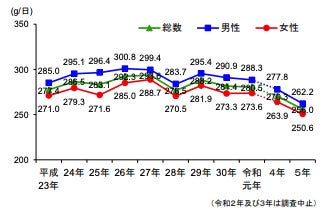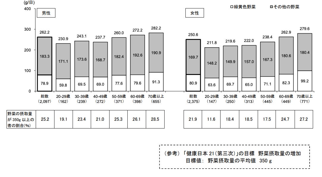 2024年11月に発表された 厚生労働省の「2023年 国民健康・栄養調査」によると、成人1人当たりの1日の野菜摂取量は平均256gで、比較可能な2001年以降で最少となりました。政府の健康づくり計画「健康日本21」が掲げる目標値は1日350gですが、実際の摂取量は減少傾向が続いています。