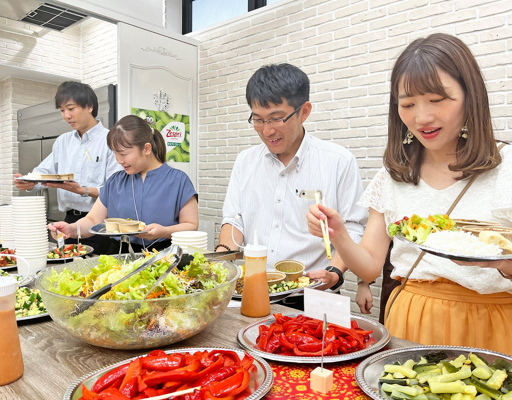大阪本社では、社員向けランチに自社製品を提供するとともに、サラダビュッフェを導入しています。このサラダビュッフェは、社員がオフィスで手軽に野菜を摂取できる環境を整えることで、健康経営の推進に寄与しています。