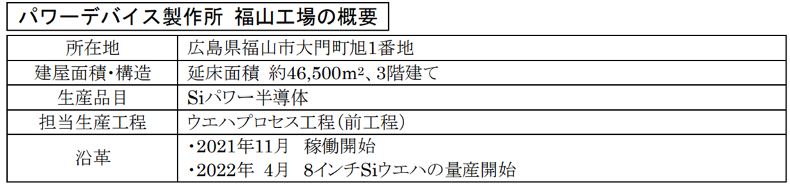 当社は、Siパワー半導体のウエハプロセス工程における生産能力を2025年度に2020年度比で約2倍に増強するため、福山工場の12インチSiウエハ対応生産ラインを公表どおり2024年度から量産移行する予定です。