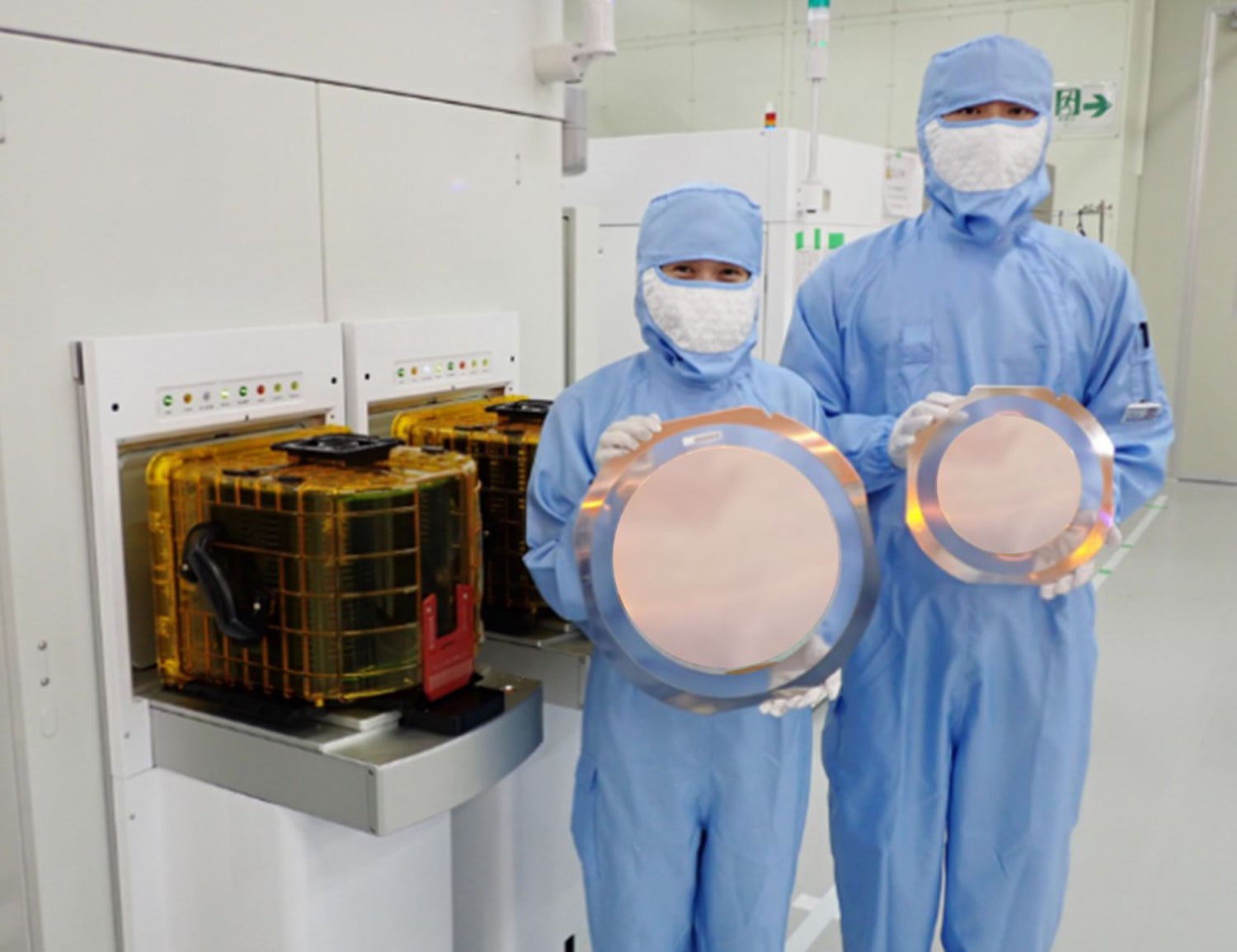 (左の作業者が持つSiウエハが今回設置ラインで製造する12インチ、右は8インチ)
