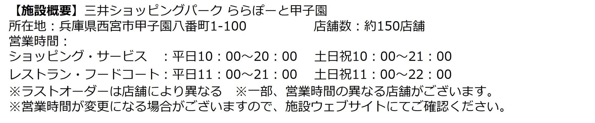 来年で開業20周年を迎える『三井ショッピングパーク ららぽーと甲子園』は、豊富なお買い物体験だけでなく、多彩なイベントも実施し、ワンストップでさらに充実した1日をお過ごしいただける施設へと生まれ変わります。阪神電車甲子園駅から徒歩約5分とアクセスも良好で、様々なエリアからもお越しいただきやすい立地となっています。今後も、地域の皆さまの「欲しい」と「楽しい」が叶う施設へと進化を続けてまいります。