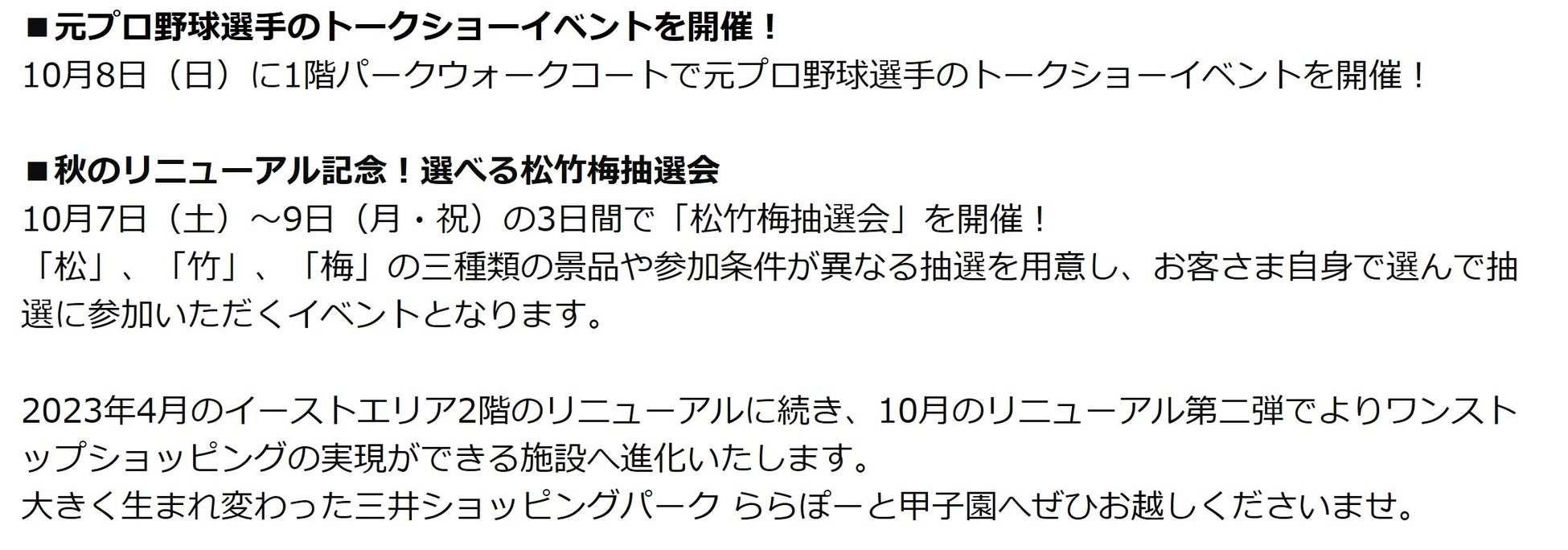 【三井ショッピングパーク ららぽーと甲子園】2023年秋 大規模リニューアル決定!新規・改装 19店舗が順次オープン