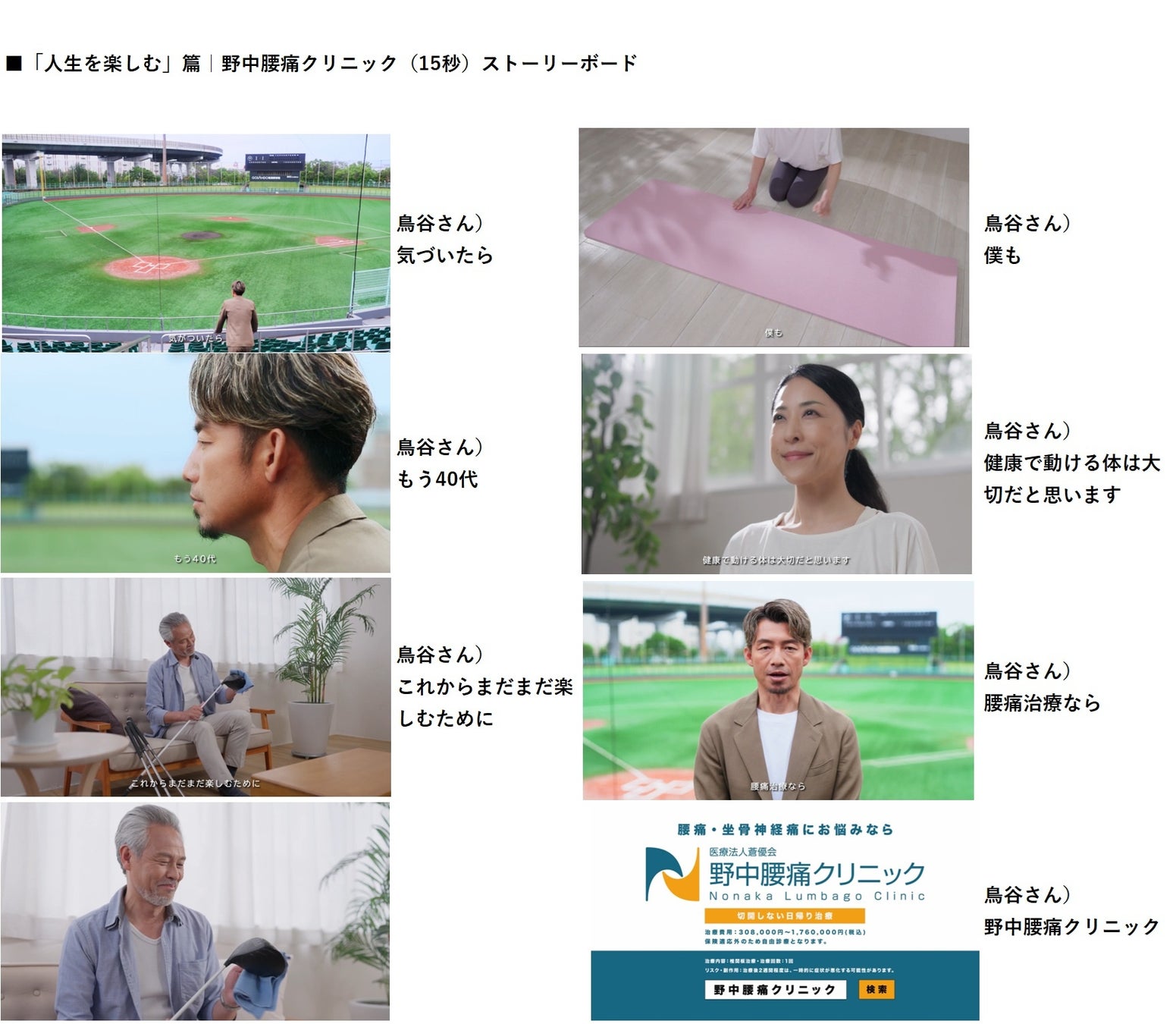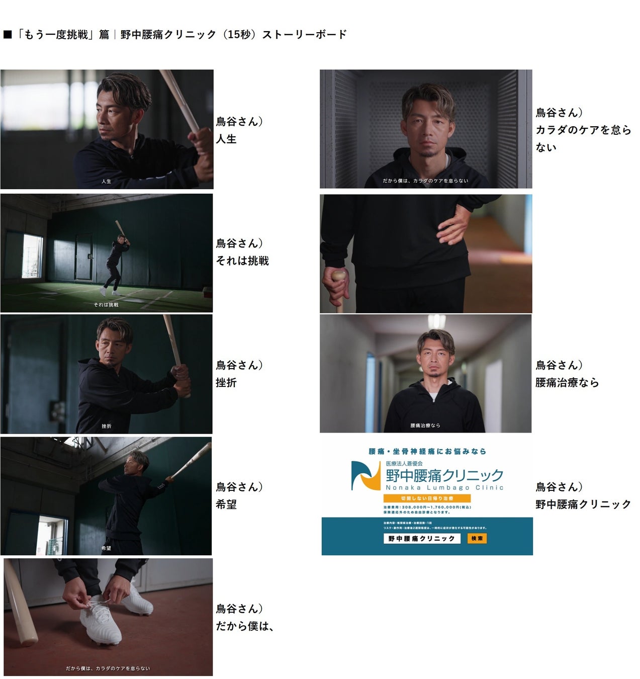 元プロ野球選手・鳥谷敬さんが再び出演 野中腰痛クリニック新CM「もう一度挑戦」篇・「人生楽しむ」篇 公開