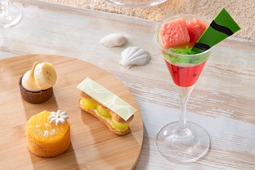 サマーアフタヌーンティーでは、夏に旬を迎える食材をふんだんに使ったメニューがラインナップ。デザートメニューでは、旬の味としてぜひ味わっていただきたい完熟したメロンやマンゴー、スイカなどを使用。さらに、お祭りやアウトドアの夏シーズンを意識して、外で食べたくなる焼きマシュマロや焼きとうもろこしなどから着想を得たメニューも加え、8種類のデザートメニューをご用意いたしました。