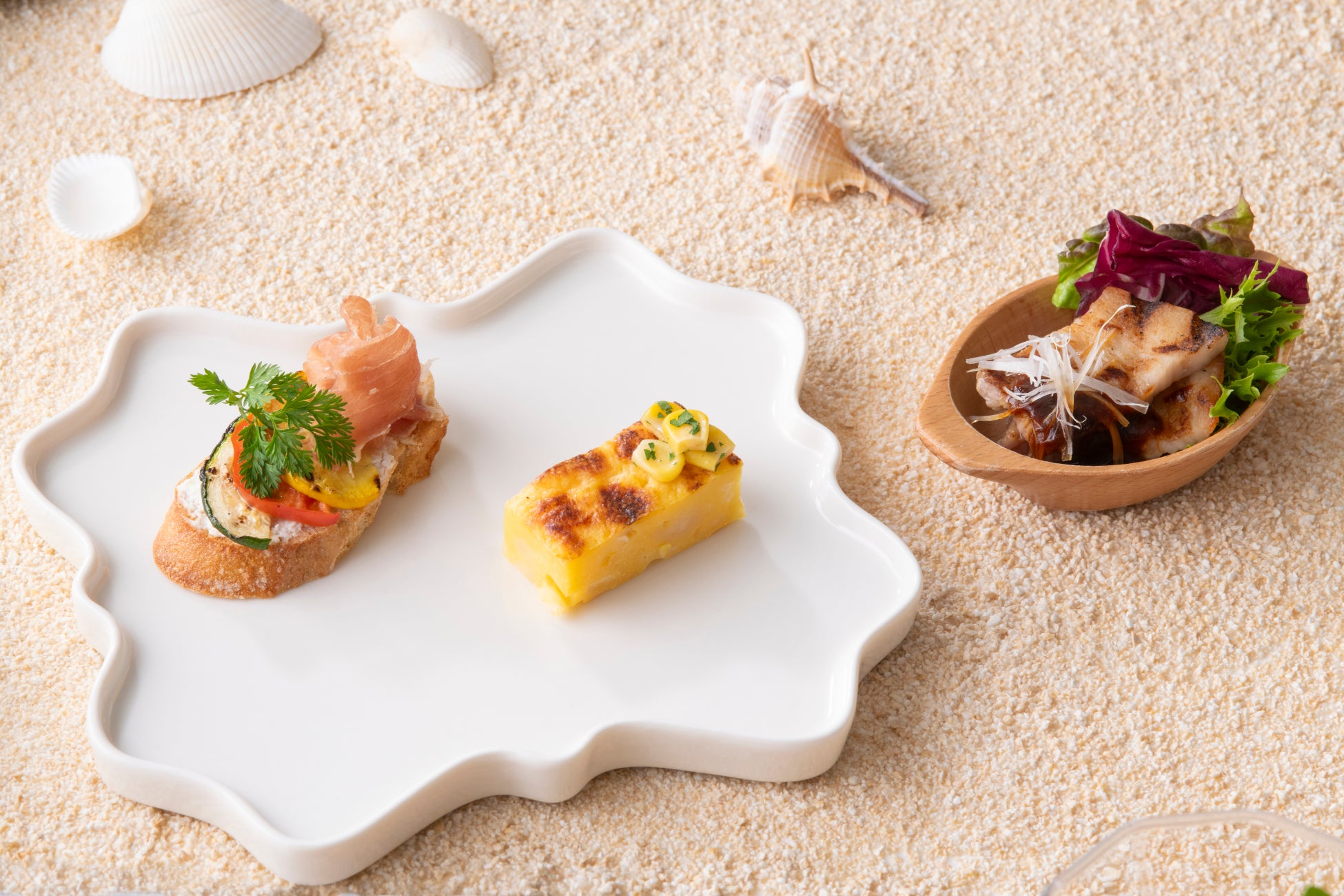 また、セイボリーには夏野菜を中心に、見た目も華やかな6種類のメニューを取り揃えました。クリームにベーコンとチーズのうま味を閉じ込めたカルボナーラブランマンジェや、とうもろこしの粉とチーズ、卵で香ばしく焼き上げたパラグアイの郷土料理ソパ・パラグアージャ、トマトソースとナス、パプリカ、バジルを組み合わせ、爽やかな味わいが楽しめる冷製カッペリーニなど、色鮮やかでみずみずしい夏野菜を使用したメニューをお届けします。