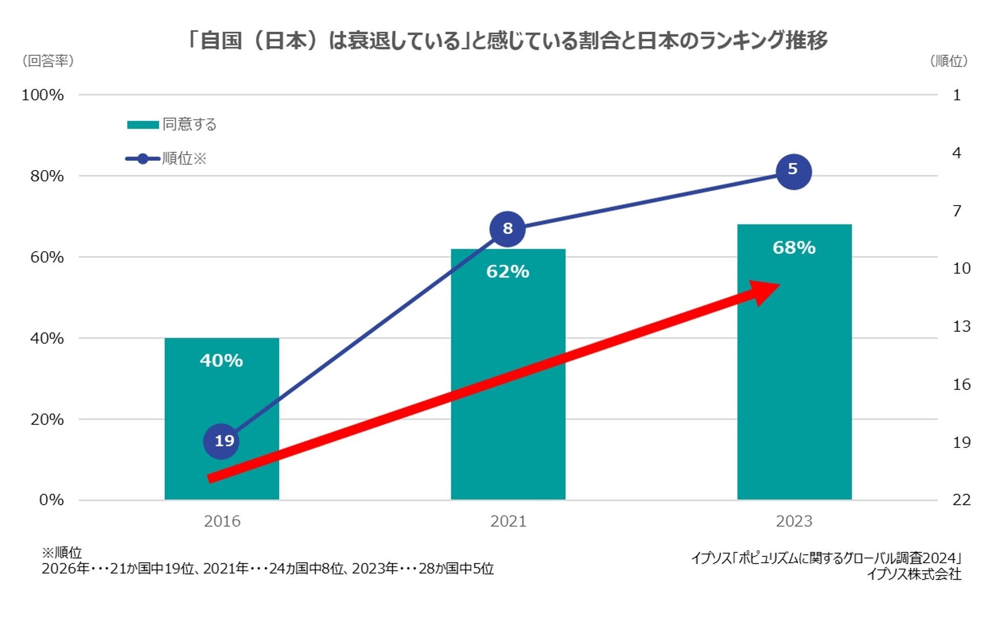 「自国は衰退している」と感じている日本人は68%、2016年の40%と比べて1.7倍に増加。