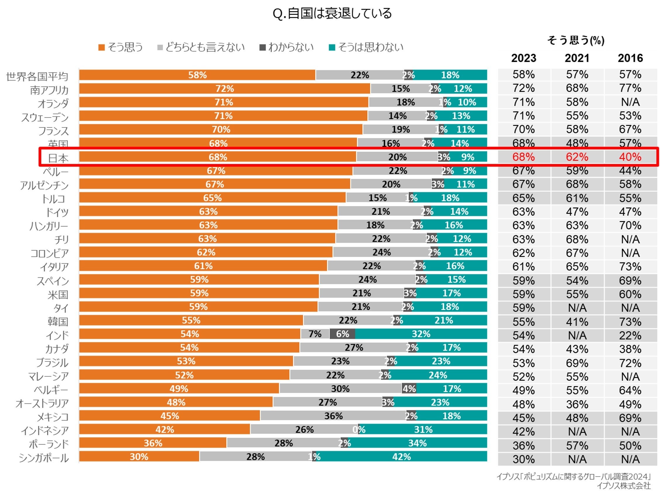 「自国は衰退している」と感じている日本人7年間で1.7倍に(イプソス「ポピュリズムに関するグローバル調査2024」)