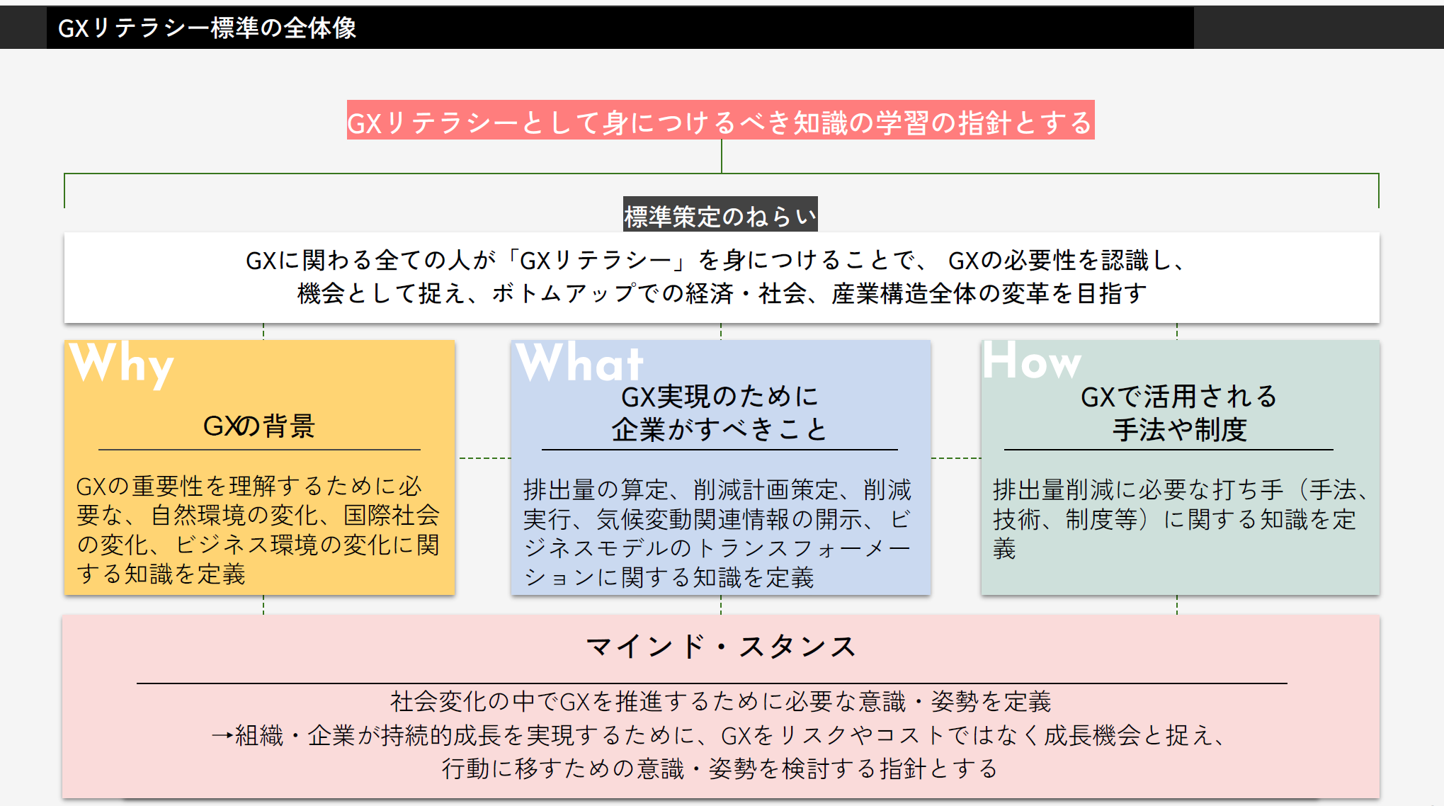 GXに関わる全ての人を対象として、GXに関するリテラシーとして身につけるべき知識と学習が期待される項目(学習項目例)を定義