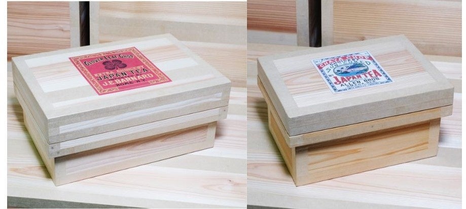 江戸時代末期から海外に輸出された茶には、茶箱に浮世絵の技術を活かした蘭字のラベルが貼られていました。今回は「男の隠れ家限定バージョン」として、2種類を復刻。お好みのデザインから選ぶことができますよ。