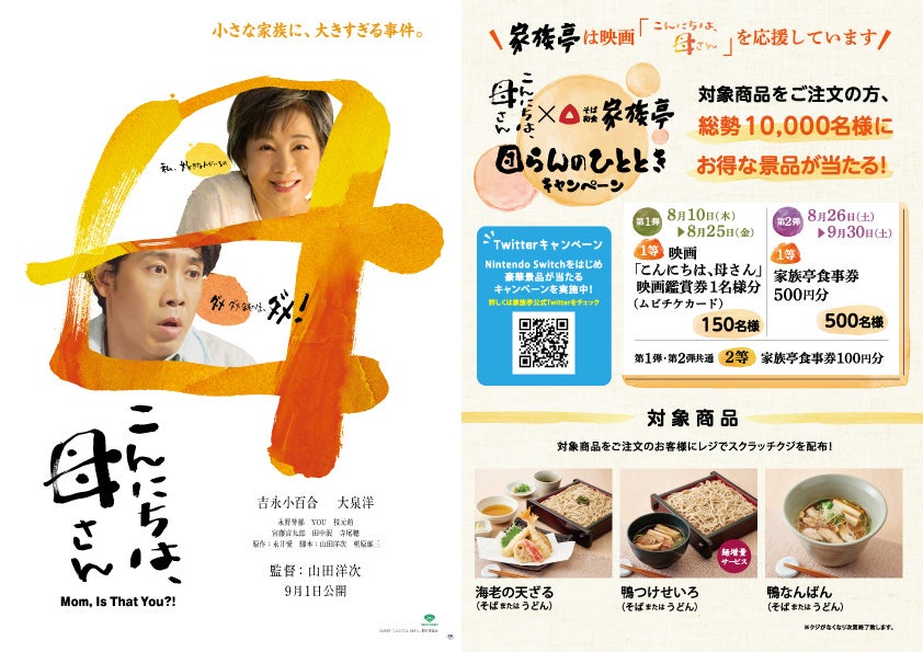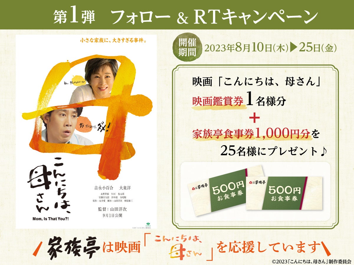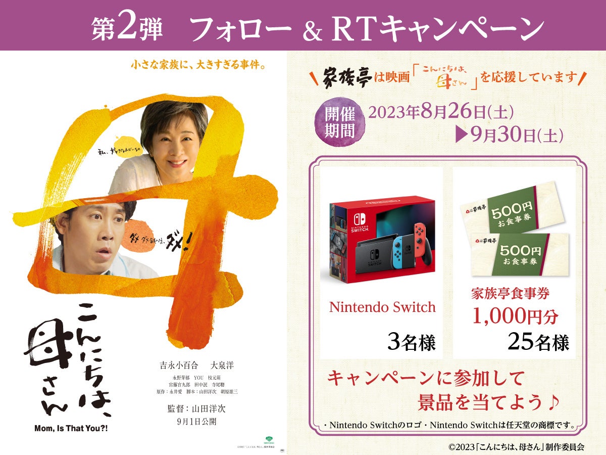 また、Twitter上ではNintendo Switchや映画「こんにちは、母さん」映画鑑賞券、家族亭食事券が当たるフォロー&リツイートキャンペーンを同時開催します。