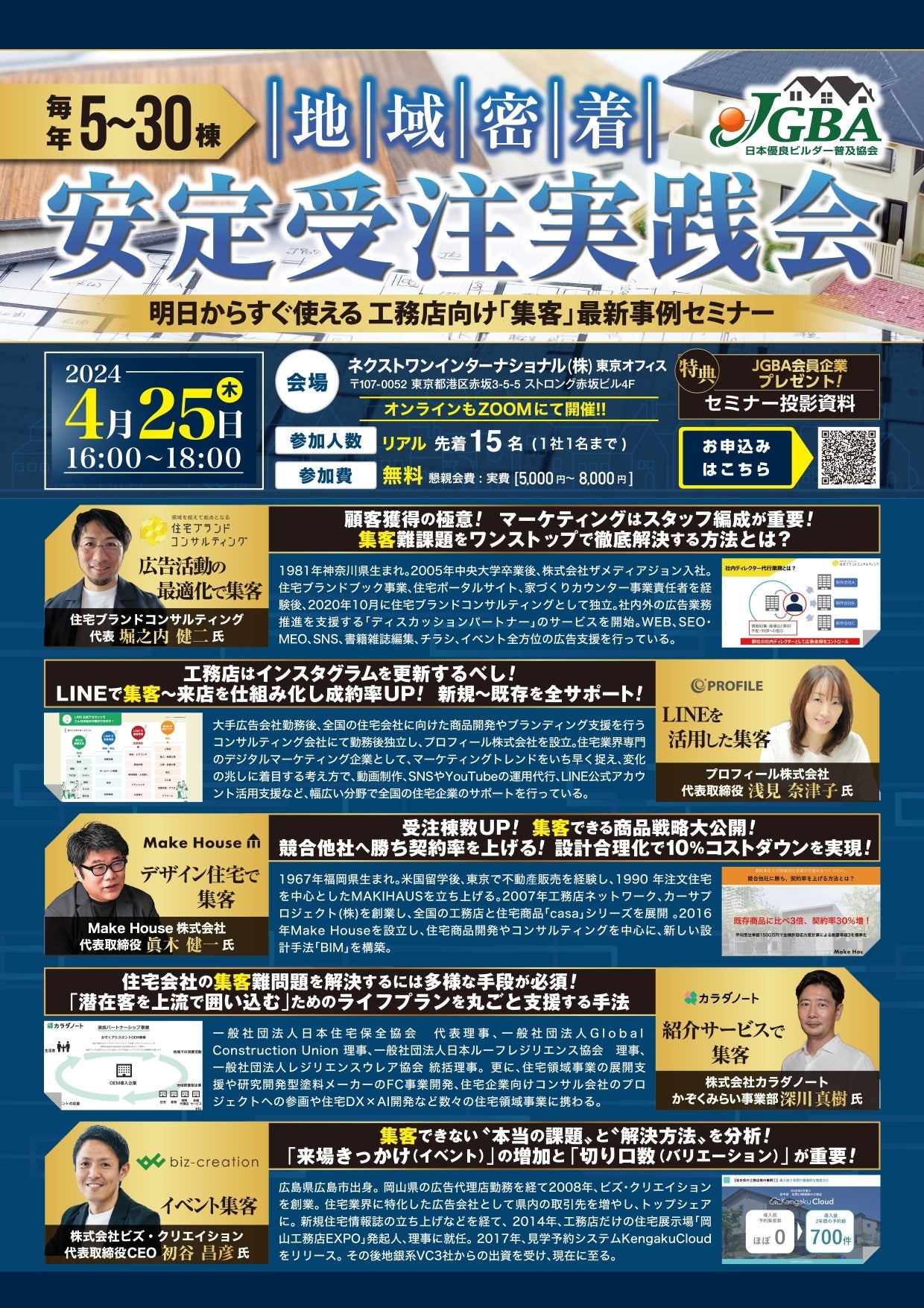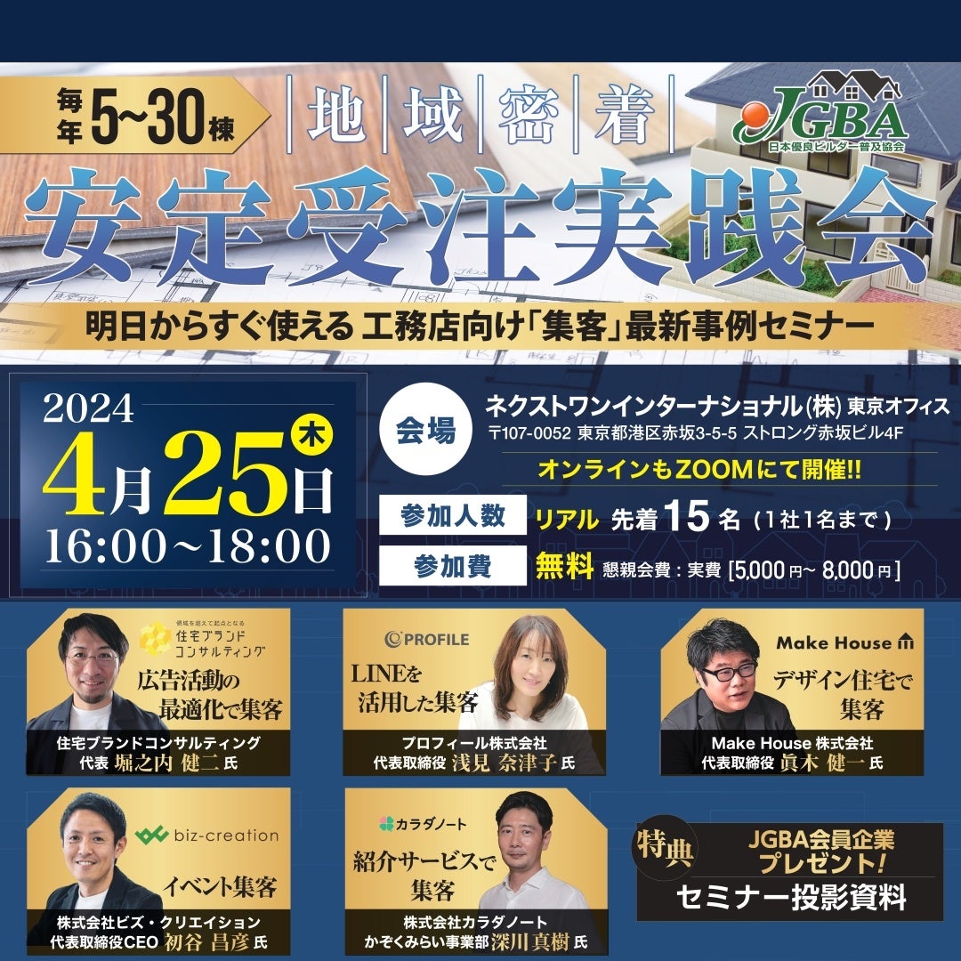 JGBA「毎年5~30棟 地域密着安定受注 実践会~明日からすぐ使える工務店向け“集客”最新事例セミナー~」開催決定