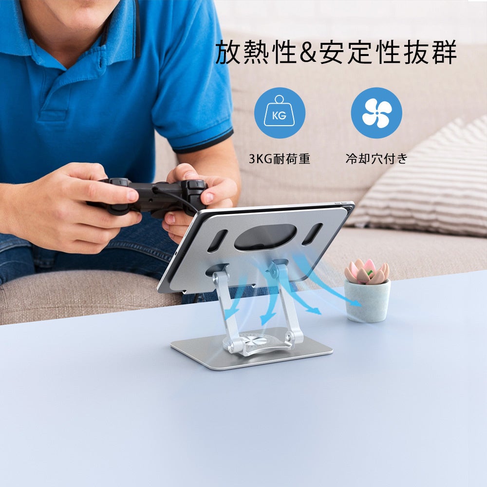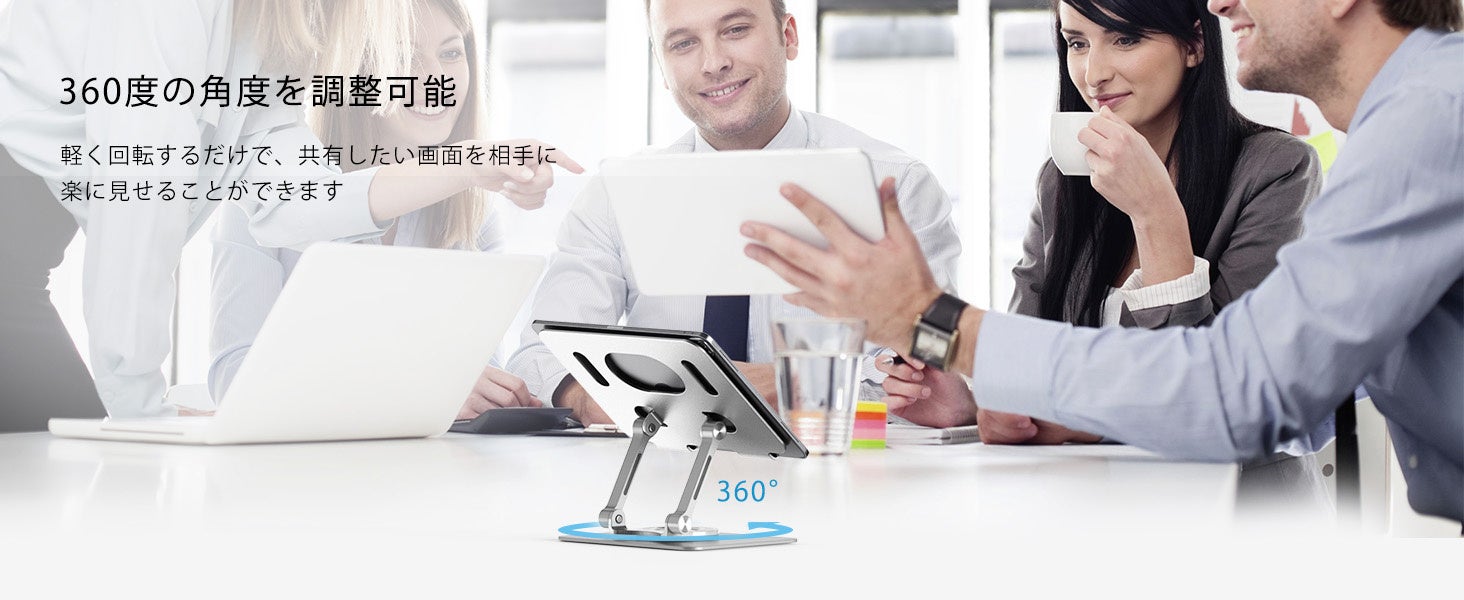 【360度回転&無段階調整可能】このタブレット回転スタンドは360°回転ベースを備えており、お使用状況に応じて、手で軽く押すだけで360度自由に回転することができます。お好みの高さや角度も無段階で調整することができます。お客様と資料を共有する際には、スタンドを動かす必要がなく、回転するだけで相手と簡単に画面を共有することができ、商談、オフィスでの会議、講演、自宅でのリモートワーク、家族と一緒に映画鑑賞などに最適なタブレットスタンドです。