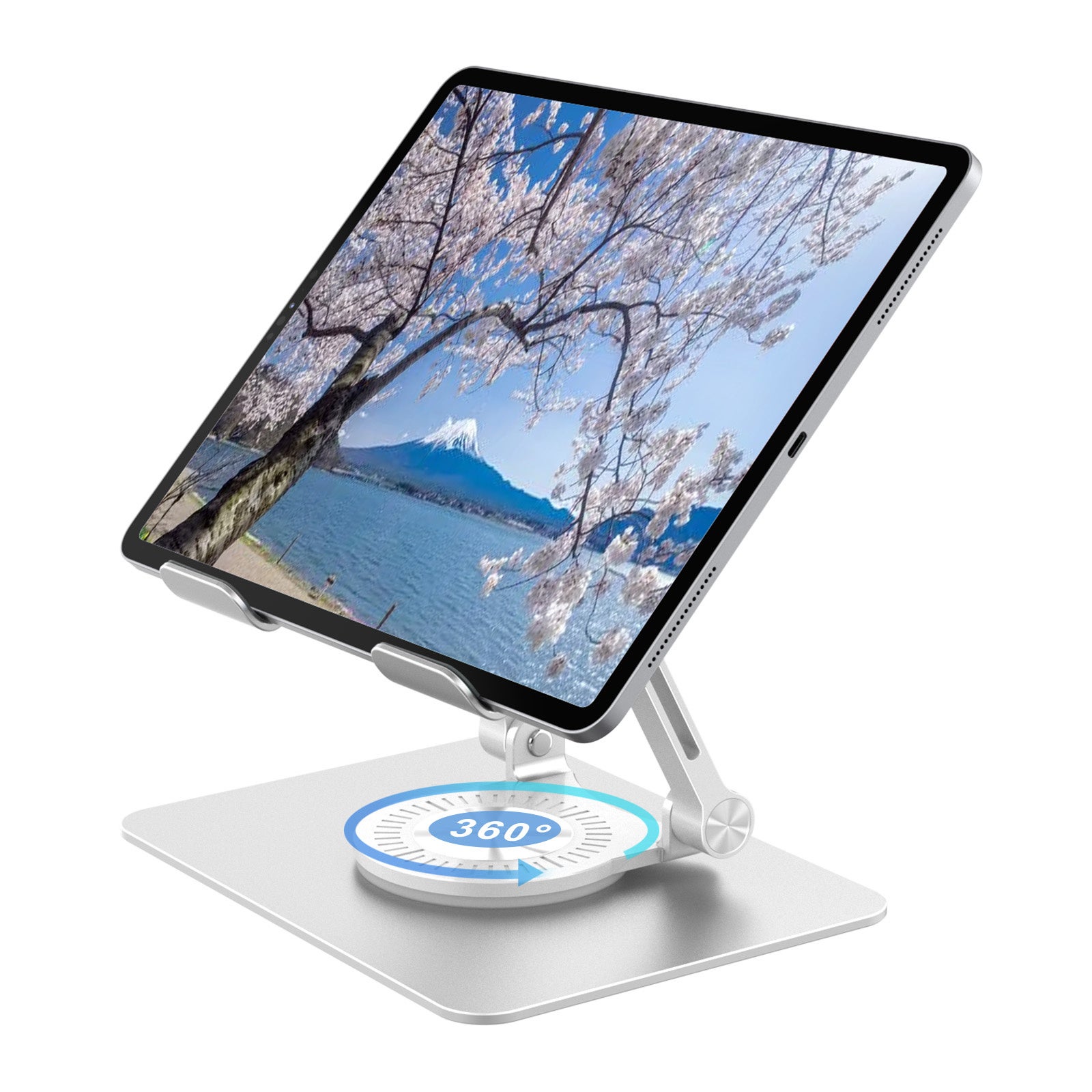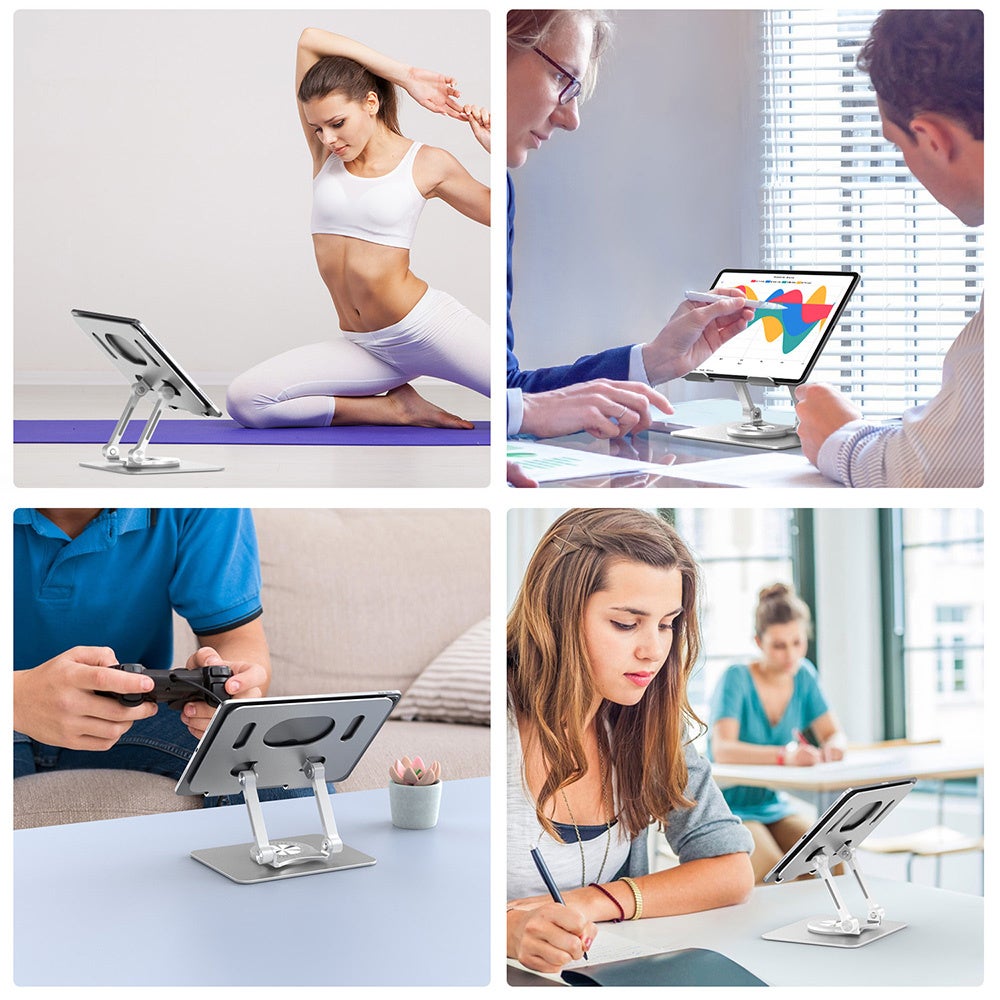 当社のタブレット用スタンドは、タブレットを簡単に高く持ち上げ、傾けて最適な視野角にすることができます。映画を観たり、電子書籍を読んだり、FacetimeやZoomミーティングを利用したり、宿題をしたり、レシピを見たり、ゲームを楽しむ際に快適さを保証します。360°回転ベースを備えた当社のタブレットスタンドホルダーでは、タブレットスタンドの角度を自由に調整して、ご希望に合った最適な視野角を設定することができます。また、コンテンツの共有も非常に簡単になります。