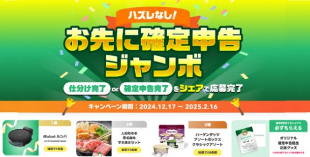 2024年12月17日より、「タックスナップ」にて「お先に確定申告ジャンボ」キャンペーンを実施しております。「仕分け*」の作業もしくは「確定申告」をアプリ内で完了し、完了画面をSNSでシェアすると、抽選に応募できます。仕分けや確定申告を「お先に」終わらせることで余裕を持って確定申告に取り組んでいただくことと、他より一歩先に動く方を称えることを目的としています。