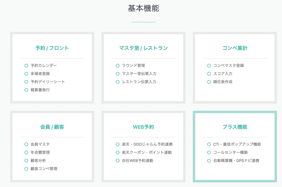 本システムは、フロント管理(精算)から予約管理、顧客・会員管理といったゴルフ場運営のための基本機能のほか、楽天GORAやGDOといったゴルフポータルサイトとの予約情報連携による集客の効率化を実現するクラウド型のゴルフ場オペレーションシステムです。