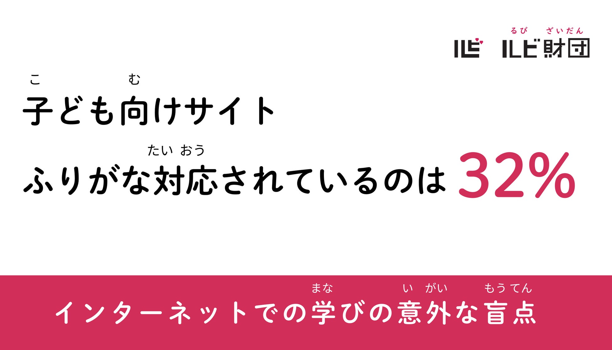 社会にふりがな(ルビ)を適切に増やすことで、あらゆる人が学びやすく、多文化が共生する「ルビフル」な社会づくりを目指す一般財団法人 ルビ財団(所在地:東京都港区、代表理事:伊藤 豊、以下ルビ財団)は、子供向けサイトにおける、ルビ対応状況について調査しました。その結果、ルビ対応がされているサイトは32%であることがわかりました。