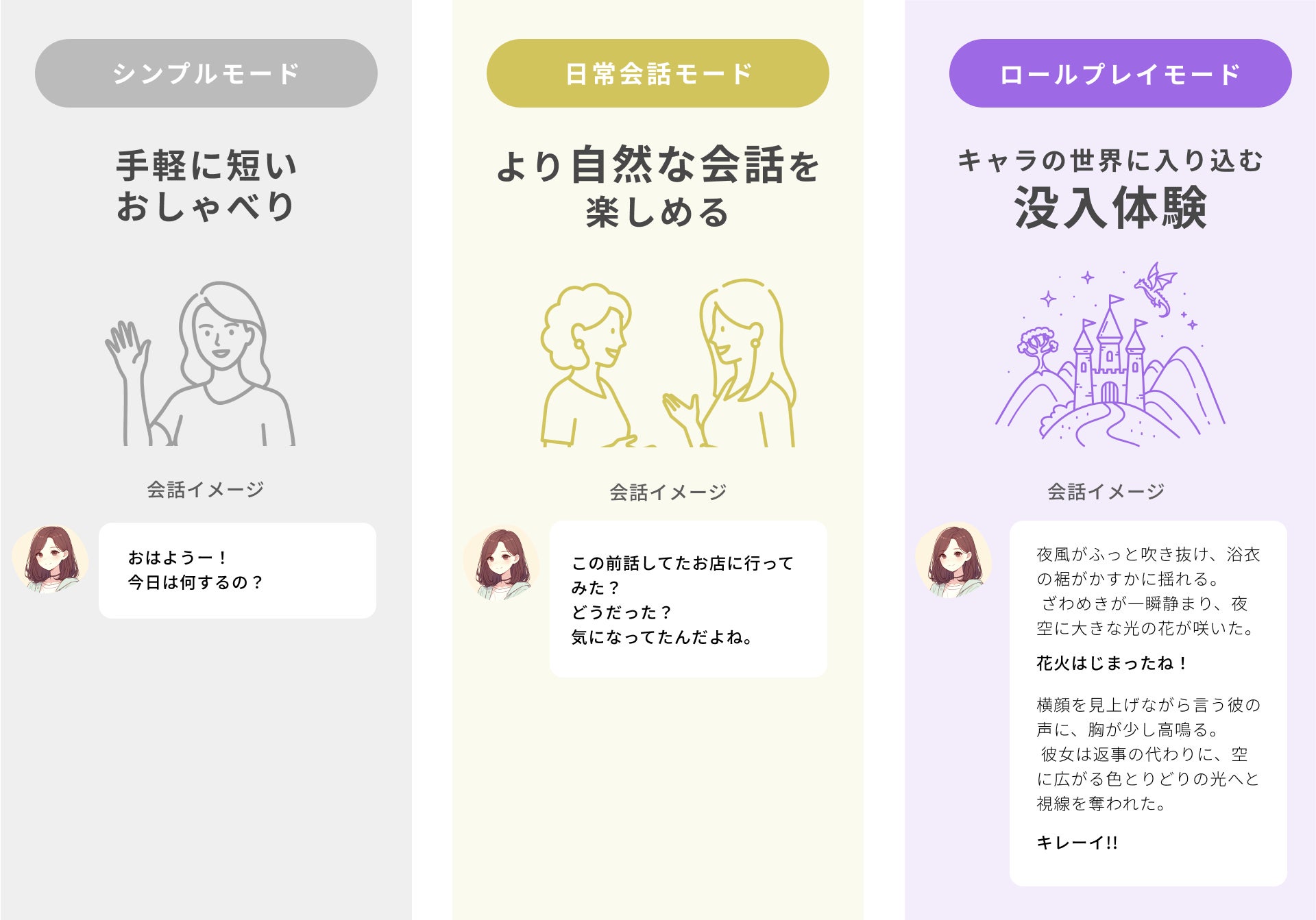 目的に応じて3つのモードを切り替えることができます。 シンプル:反応が軽くテンポも速いモードで、センテンスの短いカジュアルな会話に適しています。 日常会話:親しい友人との会話のように、よりキャラクターの一貫性が向上し、自然な会話が可能になります。(テキストでの会話のみ) ロールプレイ:キャラクターの個性や心理描写を重視し、まるで小説やゲームの登場人物と対話するような感覚を提供します。(テキストでの会話のみ) ※従来の無料会話はそのままご利用いただけます。日常会話、ロールプレイモードのみ有料となります。 |
