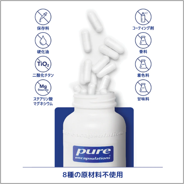 「Pure Encapsulations」はアメリカの医療専門家からの信頼度No.1のサプリメントブランド※2として、その品質に高い評価を獲得しています。「Pure Encapsulations」の製品は8つの原材料(コーティング剤、香料、着色料、甘味料、保存料、硬化油、二酸化チタン、ステアリン酸マグネシウム)を使用せず、またグルテンフリー認証機関(GFCO)で監査された施設でグルテンを使用せずに製造しています。