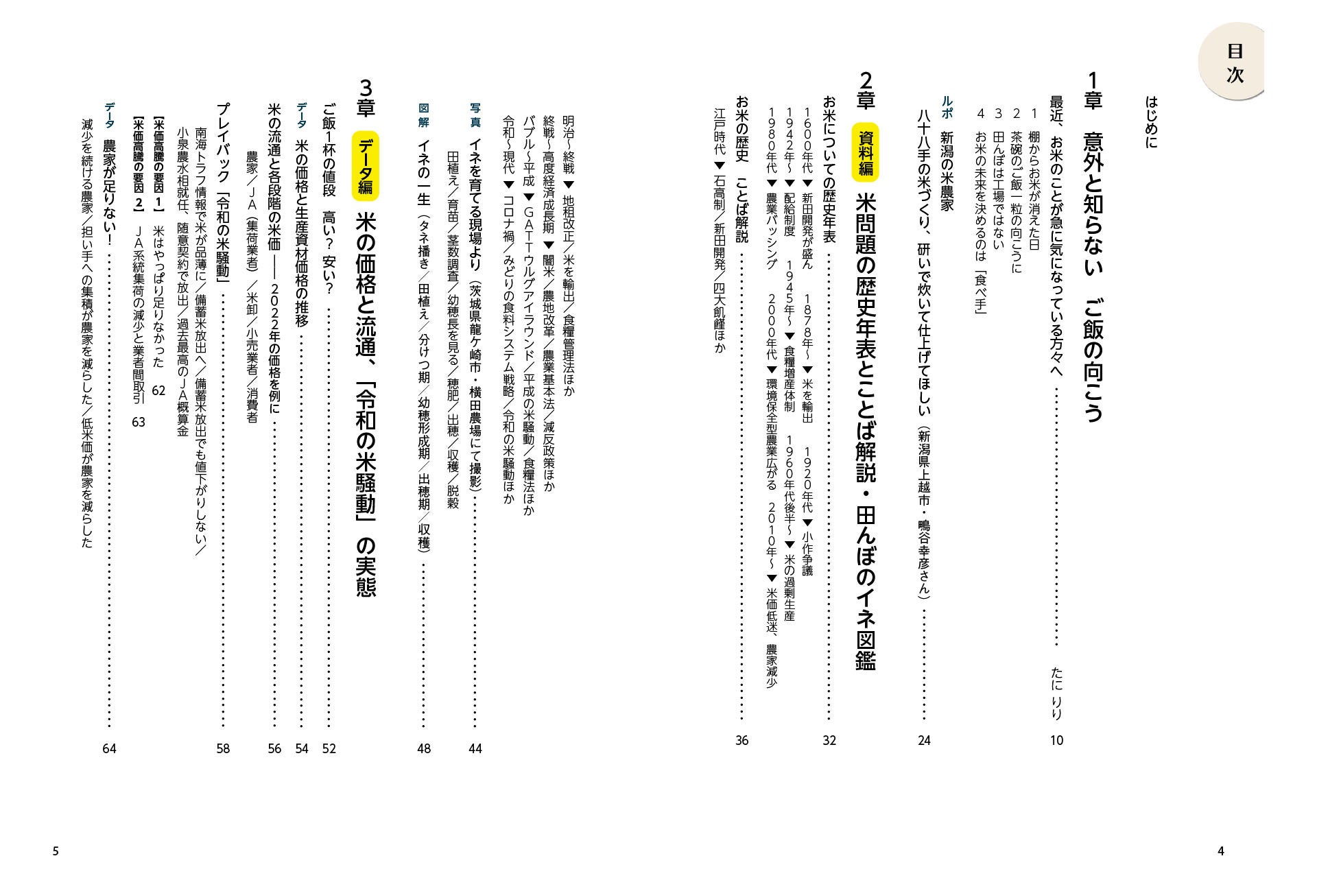 資料編として米問題の歴史年表やことば解説、データ編として米価や米騒動の推移、巻末には「農家とつながる方法&場所」のリストも付録されています。