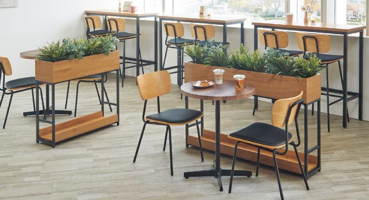 オフィスやカフェテリアなど共有スペースを、自然に間仕切ることができるボックス型パーティション。専用植栽もございます。