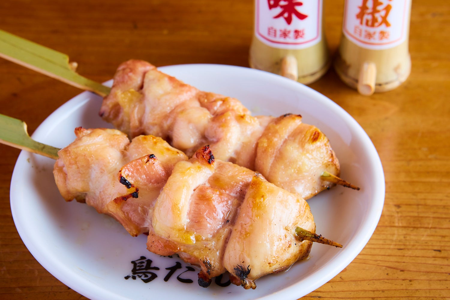 新鮮な国産鶏もも肉の焼鳥。大きさとジューシーさで食べ応え十分。