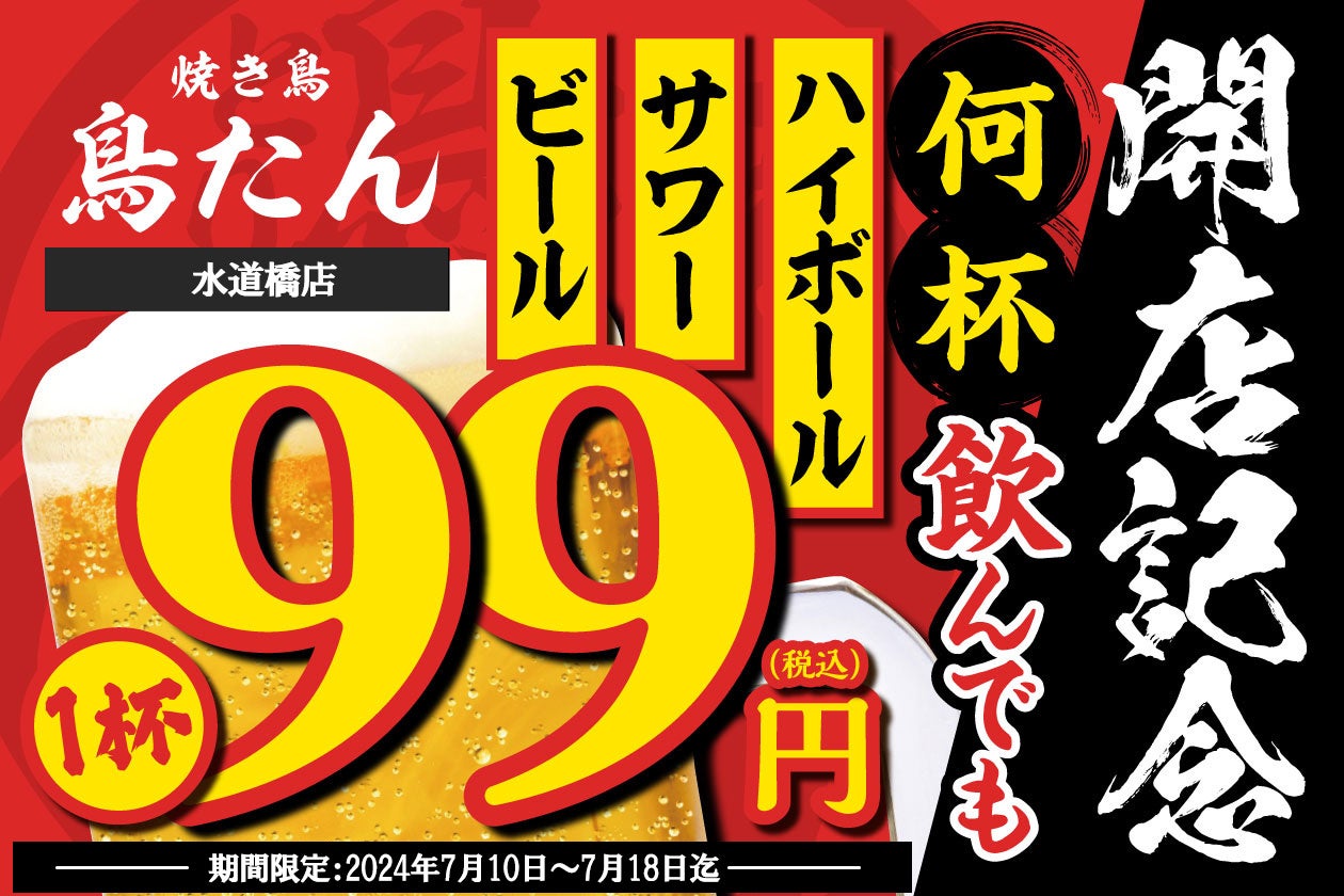 【生ビール・ハイボール・サワーが何杯飲んでも1杯99円】4号店目となる「焼き鳥 鳥たん 水道橋店」がオープンを記念して7月10日(水)~7月18日(木)の期間限定で開催