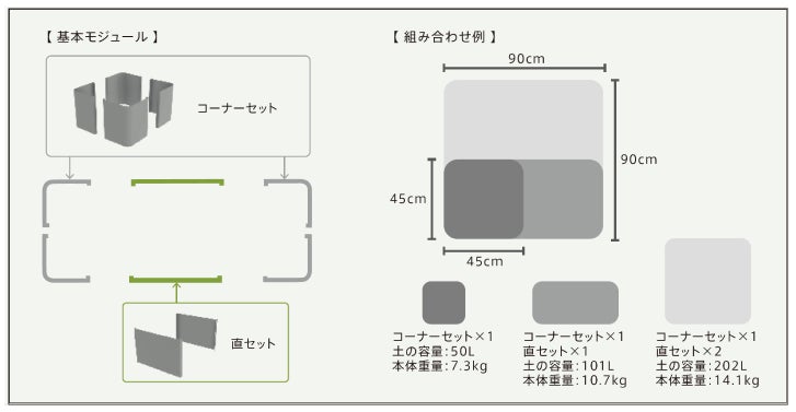 ②『囲』は直パーツとコーナーパーツとで部品が分かれており、組み立てて使用します。簡単に組み立て、分解が可能なので、大掛かりなレンガや石素材のものと比べて手軽に始められます。そのため、家庭菜園が未経験の方でも簡単にスタートすることができます。また、パーツを追加することで、後から拡張できる点も特徴です。