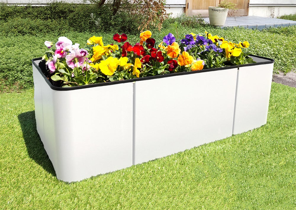 ①スチールという素材の特性上、薄くても非常に強度が高い点が特徴です。「一生使える畑」となるので、木製のものと異なり、買い替える必要がありません。スチールは錆びやすいと考える方も多いですが、メッキ加工と耐食性の高い屋外用塗料を使用することで、通常の使用方法では錆びにくく、屋外でも安心してご使用いただけます。
