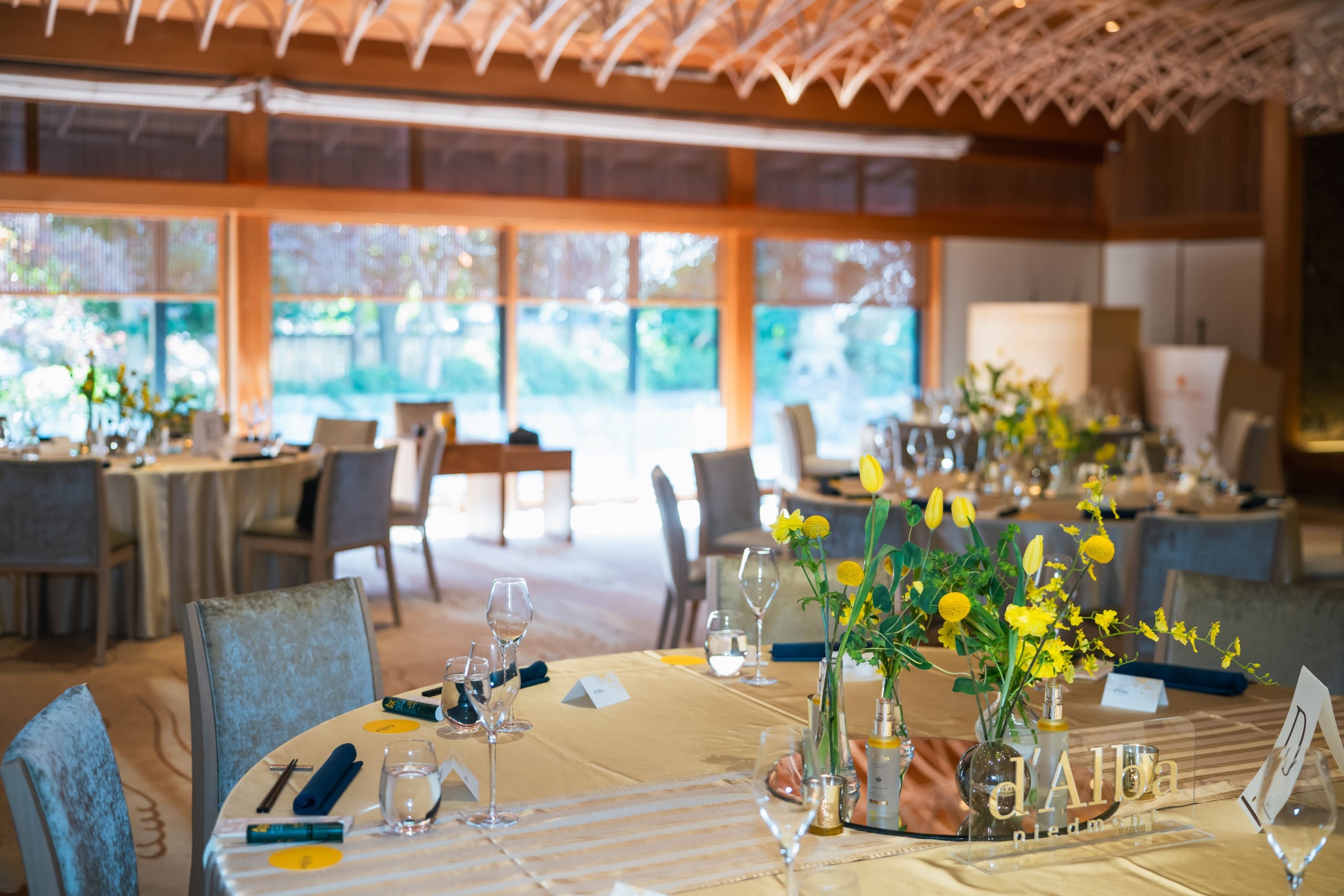 まずは、八芳園の中でも限られた場である「白鳳館」にて、華道と茶道を通じた特別な体験プログラムを実施いたしました。日本の伝統文化が持つ静謐さと美意識の中で、ダルバのブランドフィロソフィーを体感いただく、上質で象徴的なひとときとなりました。会場となった白鳳館のエントランスには、ダルバのロゴを配した暖簾を設置し、空間をブランドカラーで包み込むことで、エクスクルーシブな世界観を演出。ゲストの皆さまは、四季折々の表情を見せる日本庭園を背景に撮影を行い、日本の美とダルバが調和するラグジュアリーなビジュアルコンテンツを創出しました。