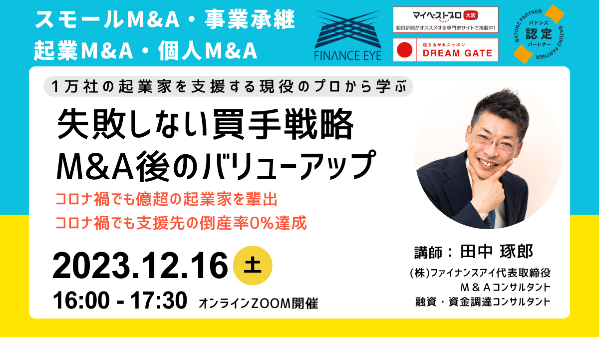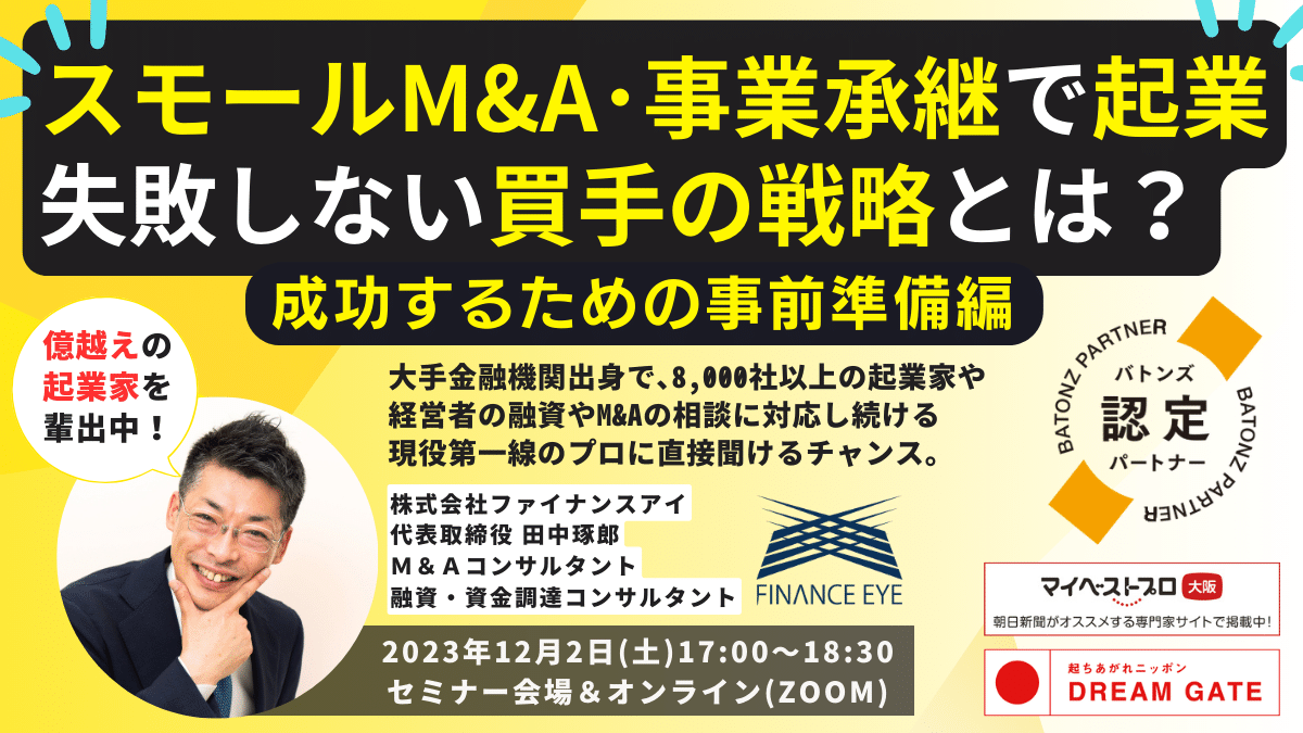 「M&A・事業承継後に成功するためのバリューアップ戦略。個人もスモールM&A・事業承継で起業。」ファイナンスアイがセミナー開催