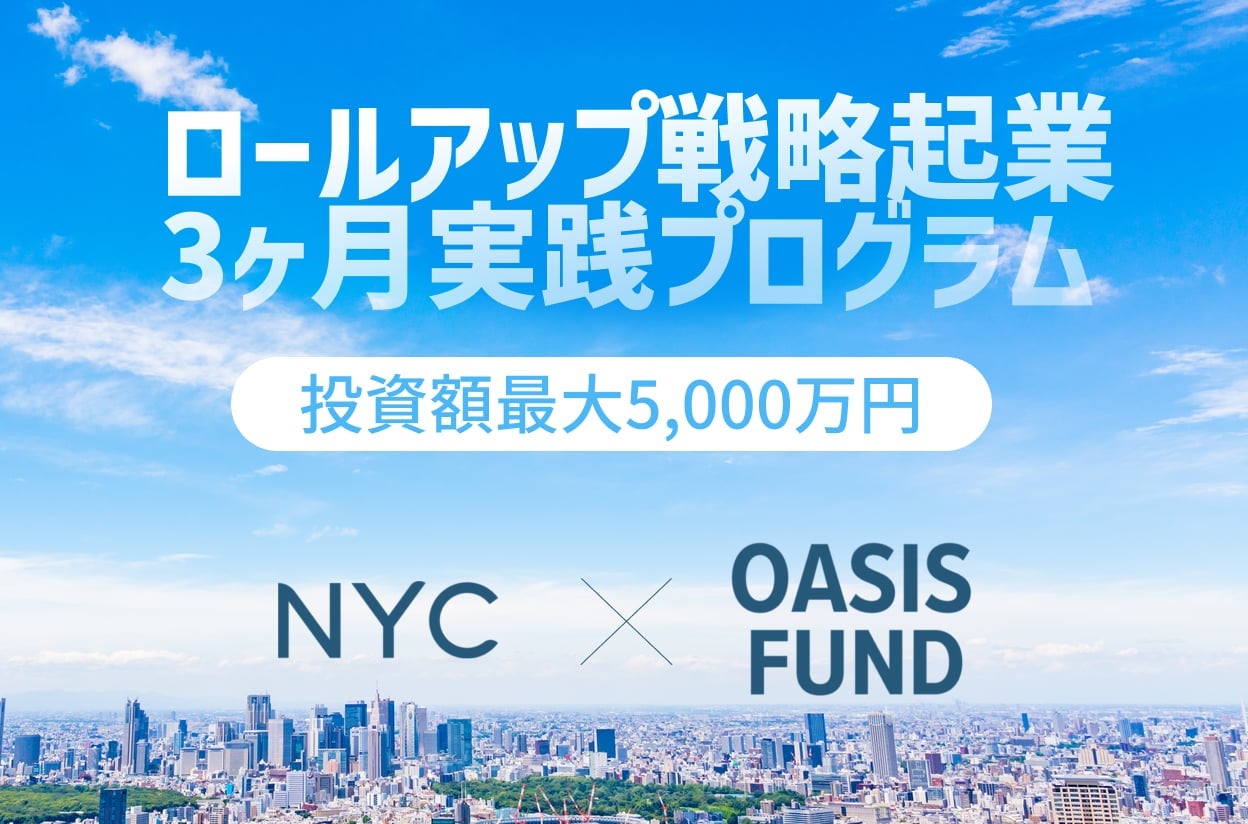 中小企業投資のプロフェッショナルであるNYC株式会社と、スタートアップ創業・支援に強みを持つOASIS FUNDが共同で提供する、ロールアップ戦略起業の実践型プログラムです。