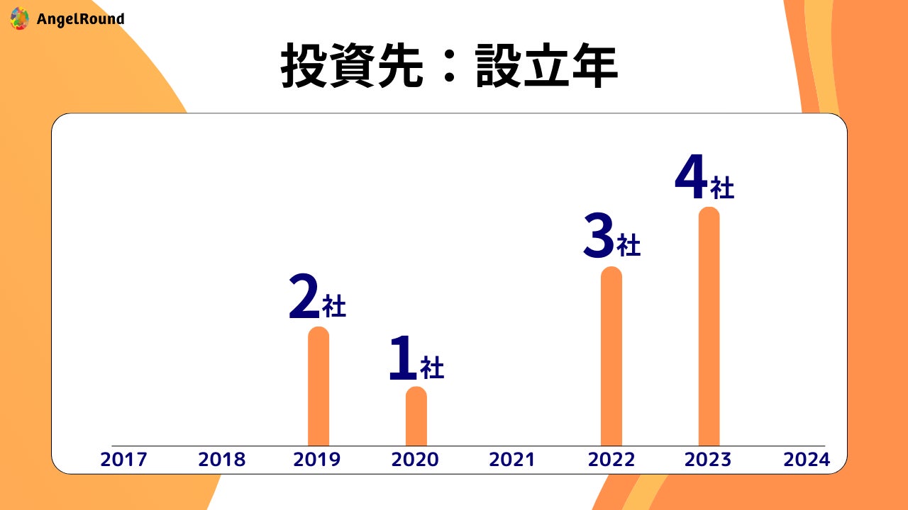 調達ラウンドがシード以下を多く占めるため、会社設立年数は6年未満となっています。設立が6年未満ですが、多くの投資先がすでに売上・利益を着実に積み上げておりソリッドな事業を展開しています。