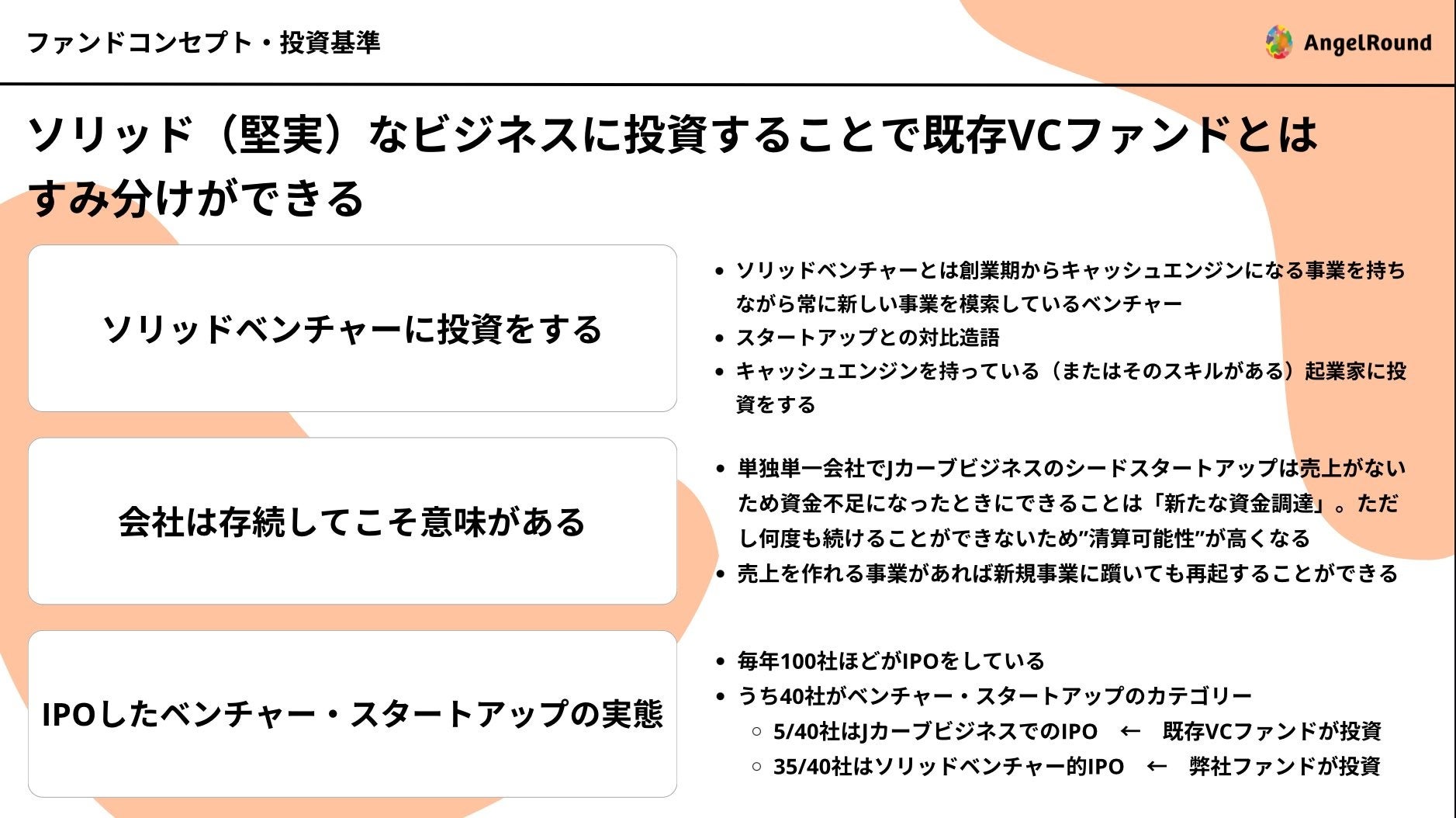 また、投資先は「ソリッドベンチャー」に特化して投資をしております。Jカーブモデルのスタートアップに投資するVCファンドが多い中、ソリッド的な売上や利益を薄くても出している企業に投資するVCファンドはほとんどありません。