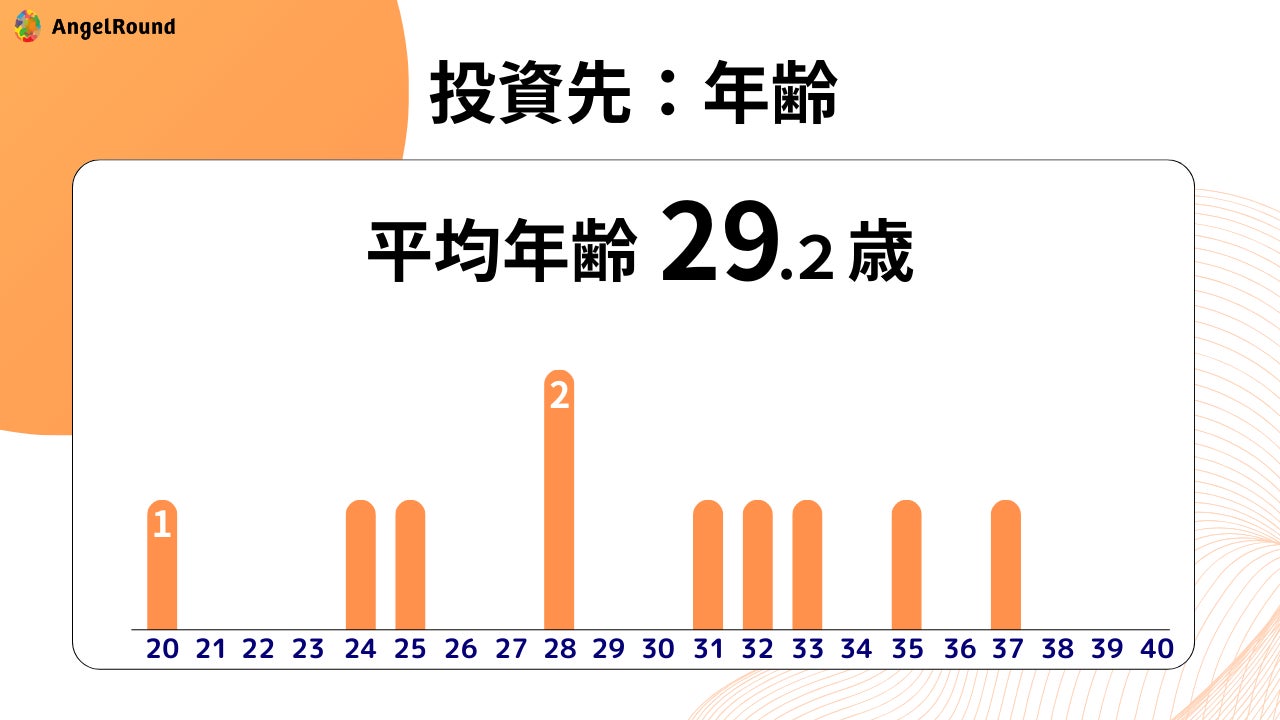 当社ファンドは「U30s(30代未満)」への投資をコンセプトにしてます。10社の投資先起業家の年齢分布で、10社の平均年齢は約29歳です。在学中に起業された方や事業会社を経て起業している方、会社を複数運営している方、売却経験のあるシリアル起業家などみなさん様々なキャリアをご経験されています。