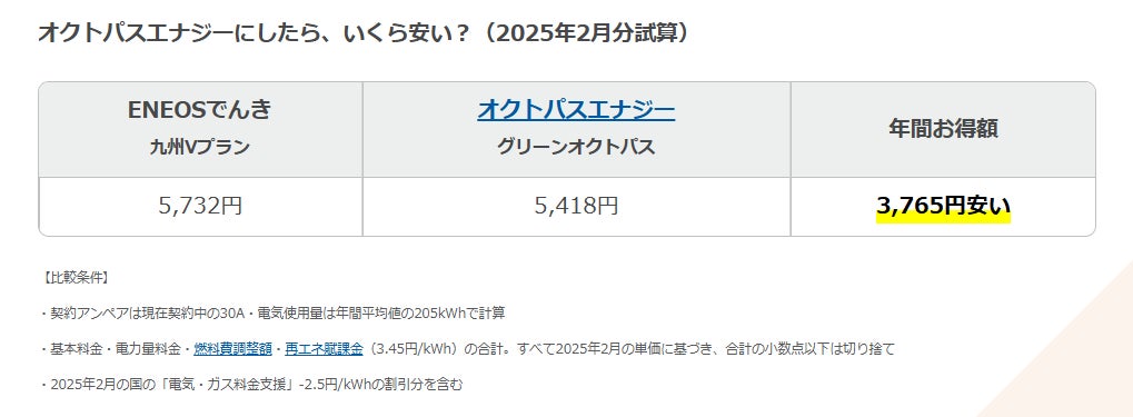 例えば、九州電力エリアの一人暮らしに安くなりやすいオクトパスエナジー「グリーンオクトパス」に切り替えると、年間3,765円の電気代削減が見込めます。